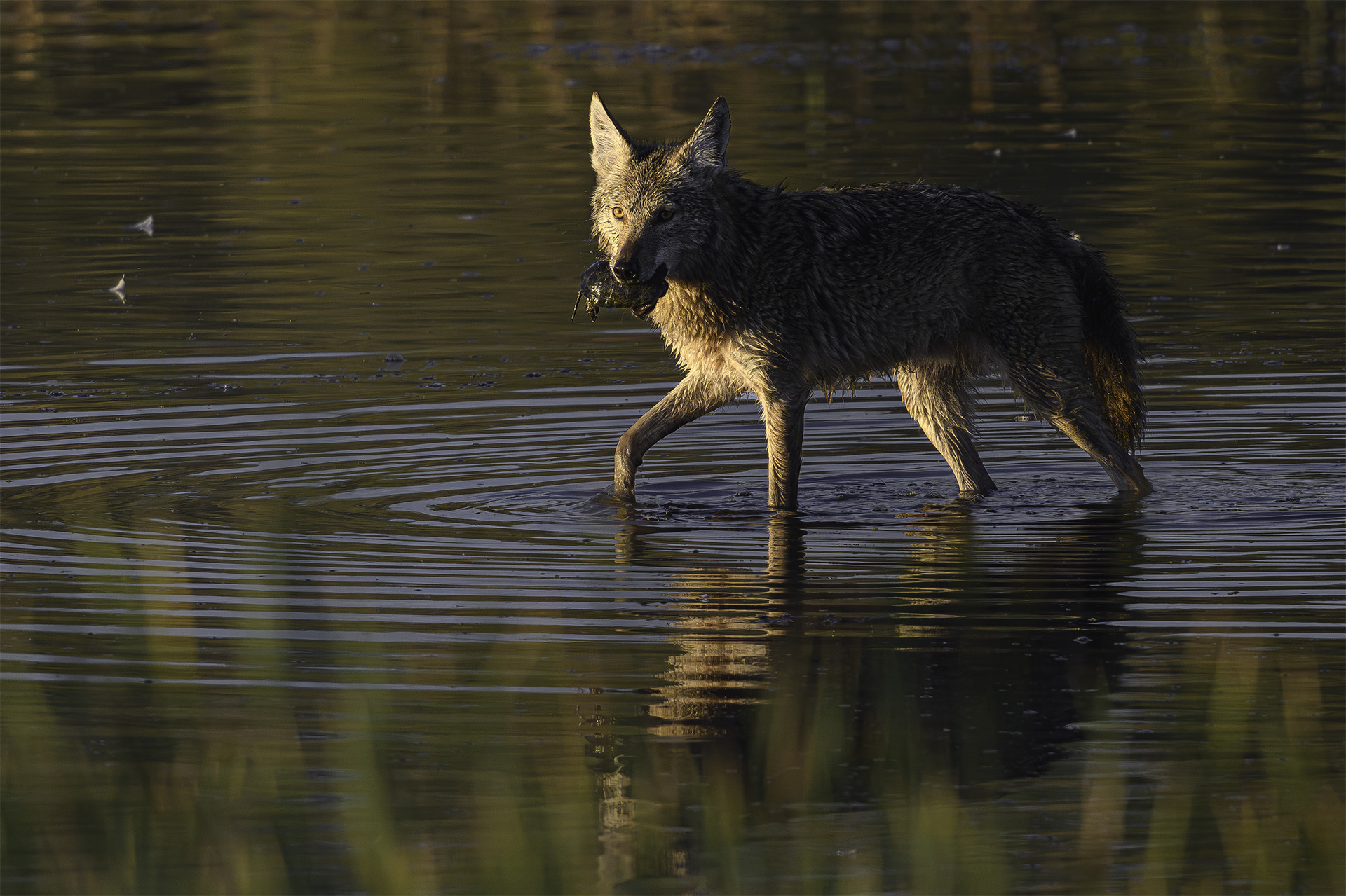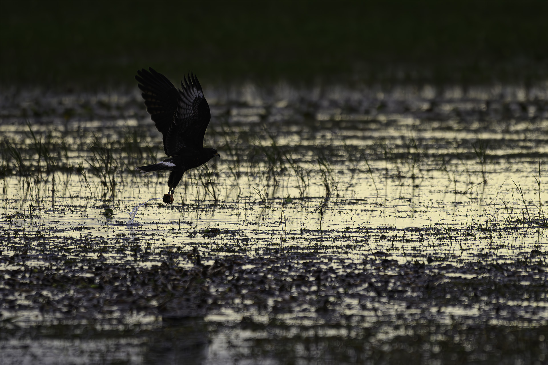 One early morning on Lake Kissimmee in Florida last week, we watched a female Snail Kite snatching an Apple Snail from the shallow waters of the lake. She is almost a complete silhouette against the morning sunrise that turned the surface of the lake a shimmery silver. A trail of water cascades off the snail that she will soon consume.