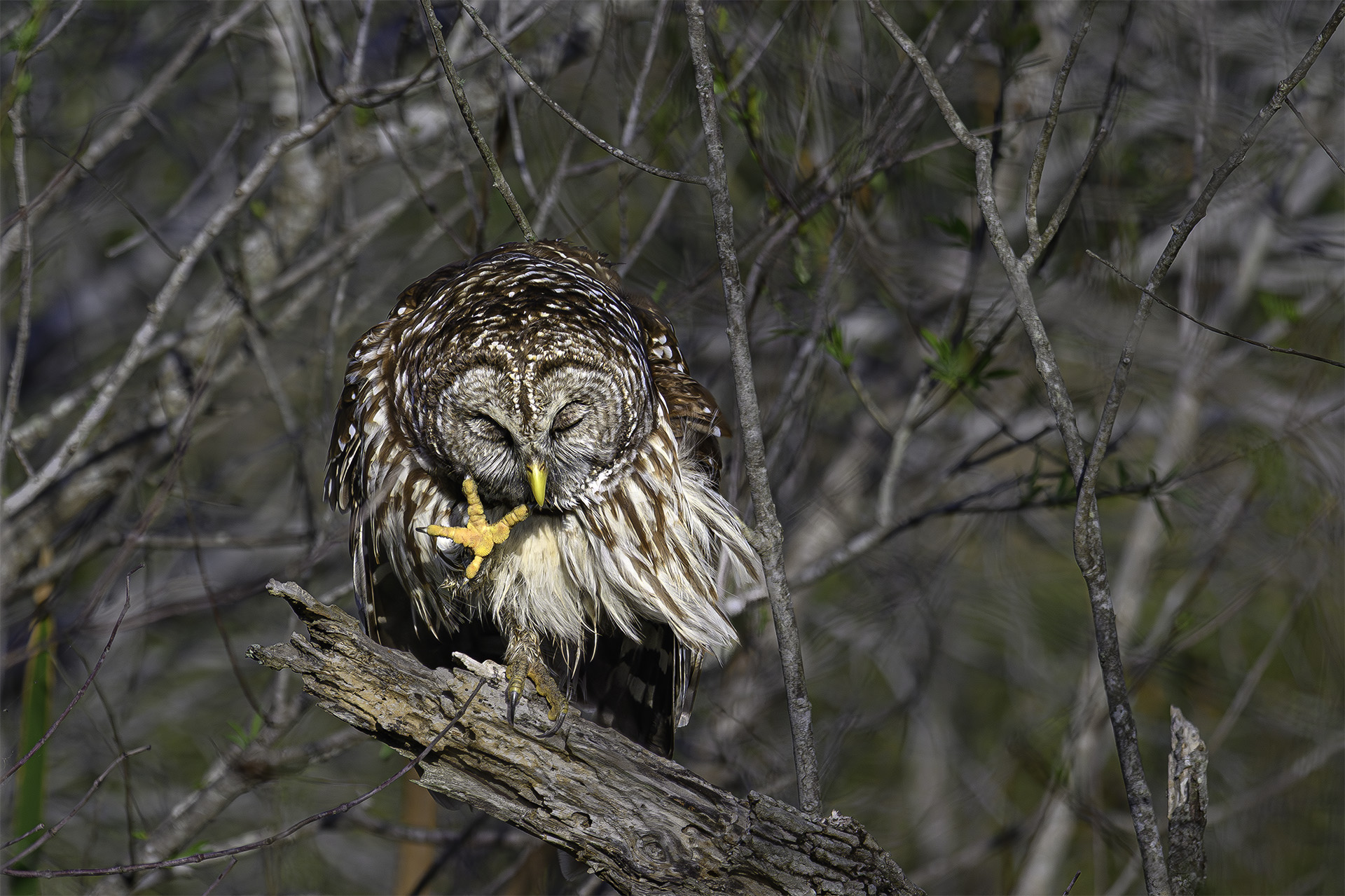 A preening Barred Owl seems to be gesturing to “gimme four!”