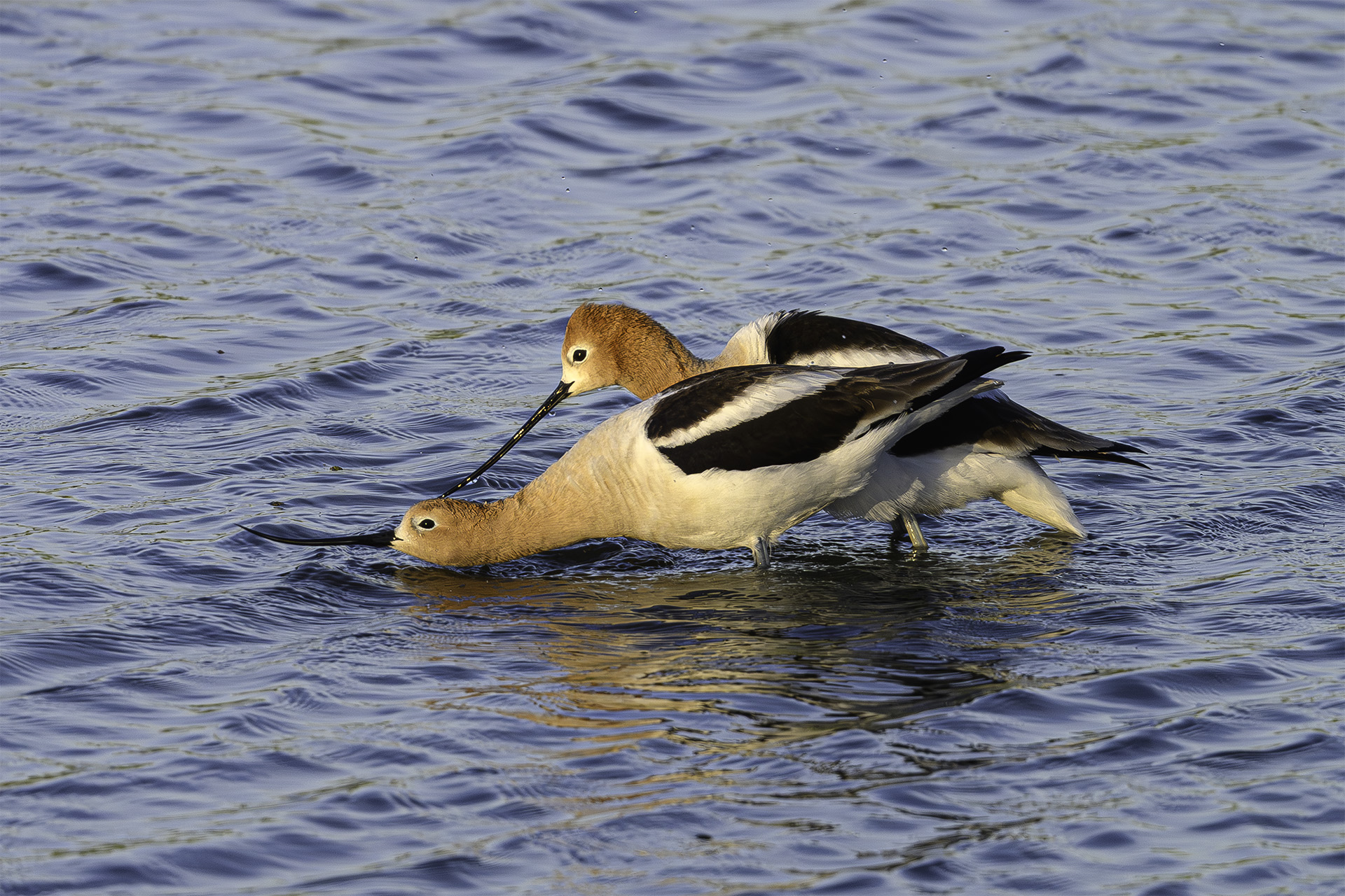 There has been excitement and anticipation by the regulars at the Salt Pond this week because we have finally seen a pair of American Avocets there. Last year, the pair (could it be the same pair?) had an exposed nest that was destroyed before they produced a brood. Yesterday morning, three of us witnessed the pair mating. Until then, we’d only seen them separately on the pond and weren’t even sure there was a male and a female. The funny thing is that the female was ready and waiting patiently for the male to do something. She was standing still with her head down while the male seemed clueless at first, standing near her but not doing anything. He finally waded around her and in the first image, seems to be expressing some interest. Then, in the second image, he mounted her and finally, they strolled away, heads together. Ahhh. Avocet amore.