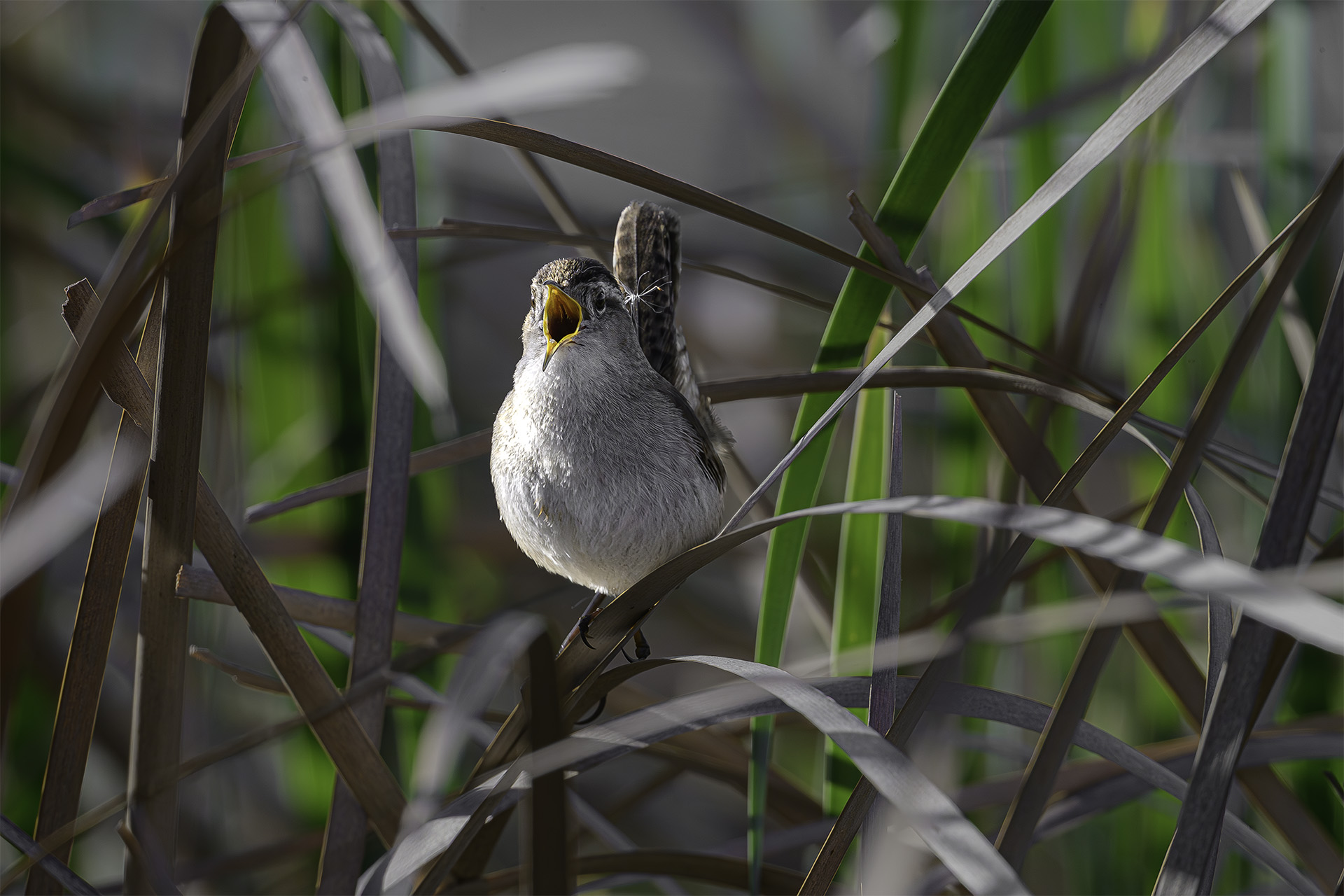 Most mornings along the Ferrari Pond Trail, I can hear the Marsh Wrens calling. But they are small and they can easily conceal themselves deep in the cattails and reeds. The other morning, this little one was vocalizing right at the edge of the trail and it was surprisingly visible although sometimes a reed covered its face. I thought the cattail seedling that is stuck to its head was quite charming.