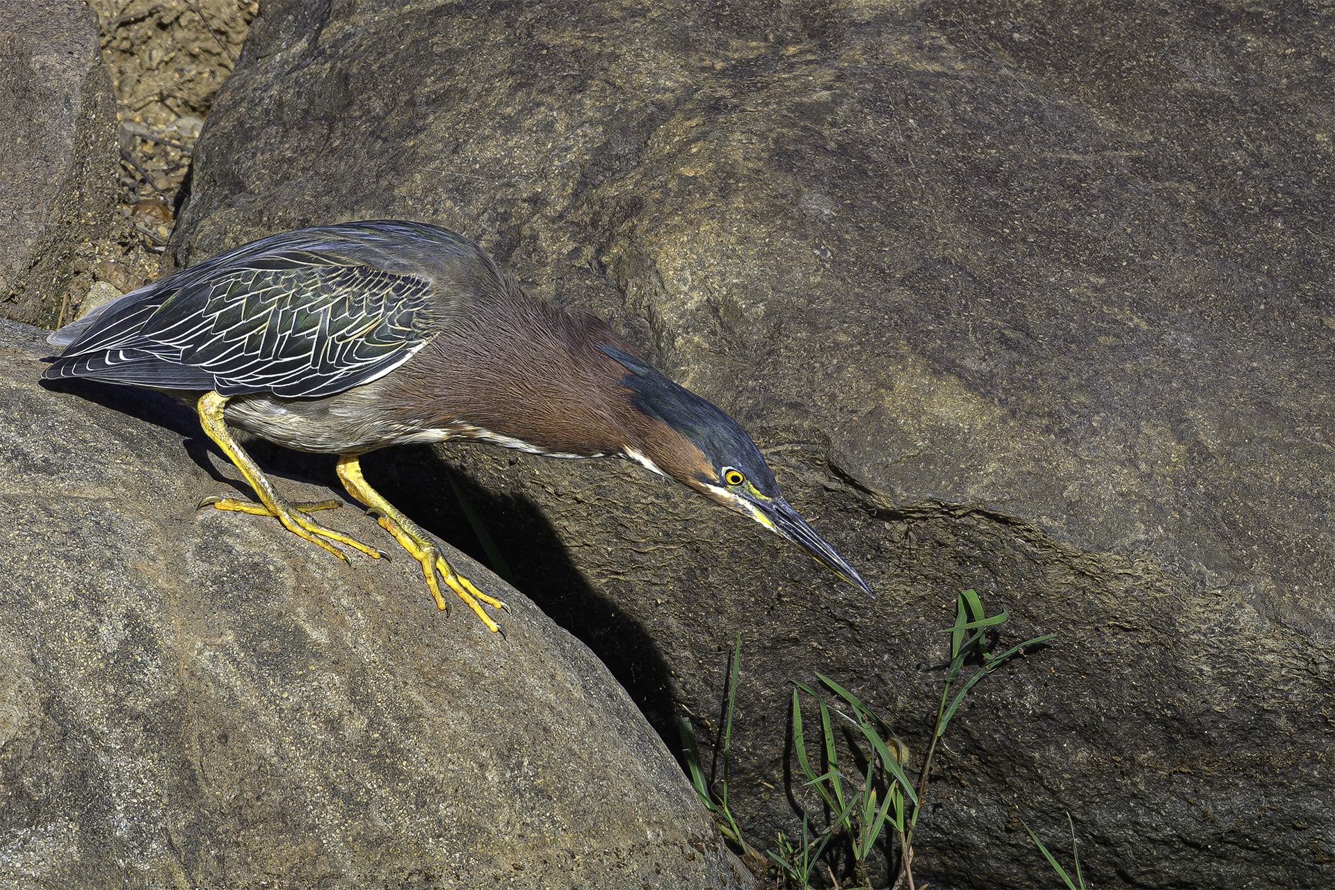 The other morning, a Green Heron lurked on the rocks across Angler’s Cove as I walked by, headed back to my car. A trait that herons share is their patience and ability to stand absolutely still as they wait for prey to pass in the water beneath them, so that is what makes it relatively simple to capture them waiting. The water was about a foot from this Green Heron but herons are so fast, the distance doesn’t seem to matter that much. And, that speed is what also makes it so hard to capture the moment they go for their prey. I was happy to get this bird seconds before it stabbed into the water and flew off.