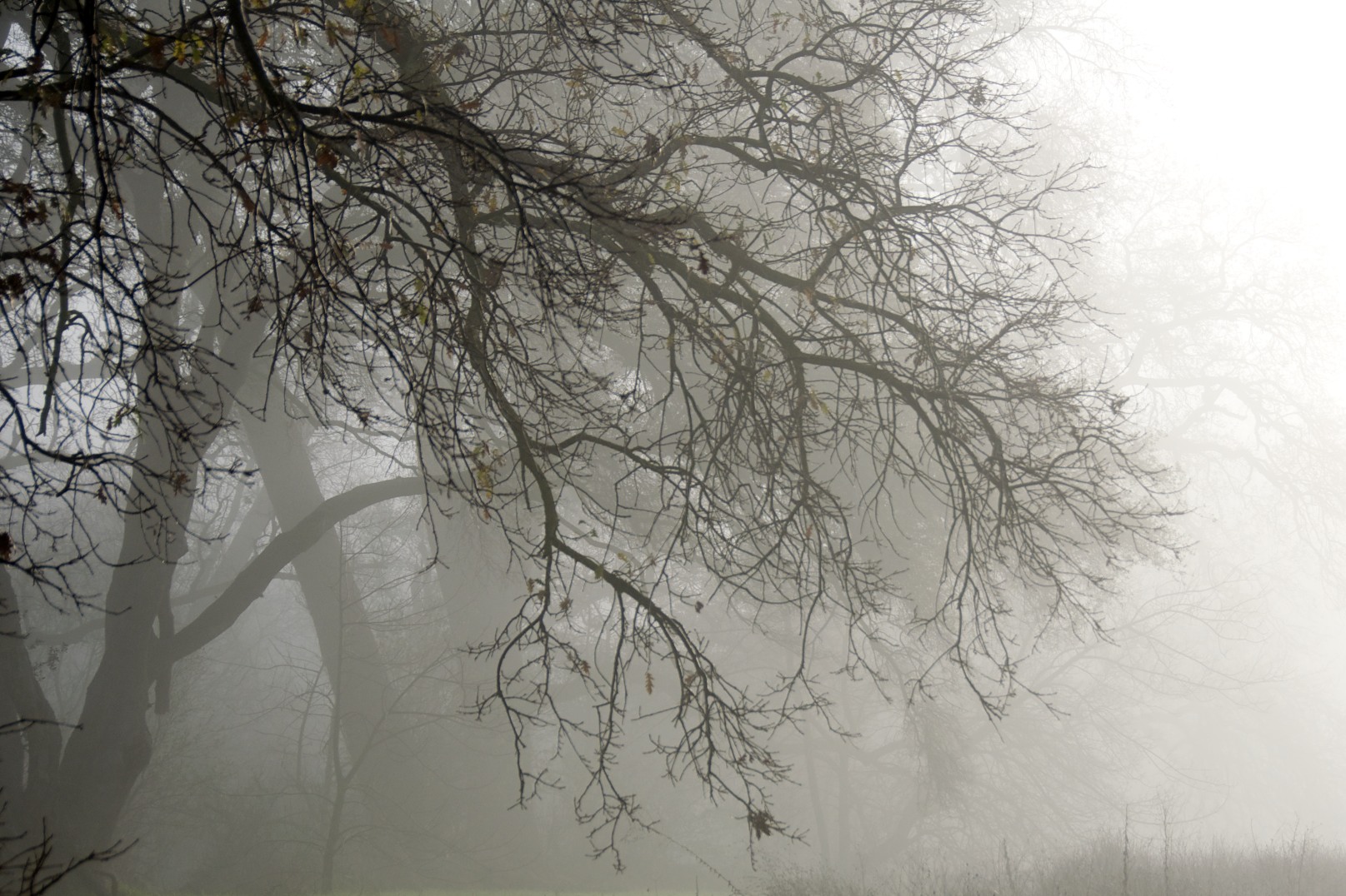 I took my camera with me to the gym this morning because the valley tule fog was hanging thickly on my route and I wanted to try taking some photos in the fog. Quite a challenge I discovered, especially because the ISO was set to 1600. Once I changed the ISO to 200 I got better results but I should have changed the metering to spot metering from matrix metering so that I would have had better exposure on the foreground branches. I had to tweak the photo a bit in Aperture, using Auto RGB in the Curves setting to enhance the foreground branches.