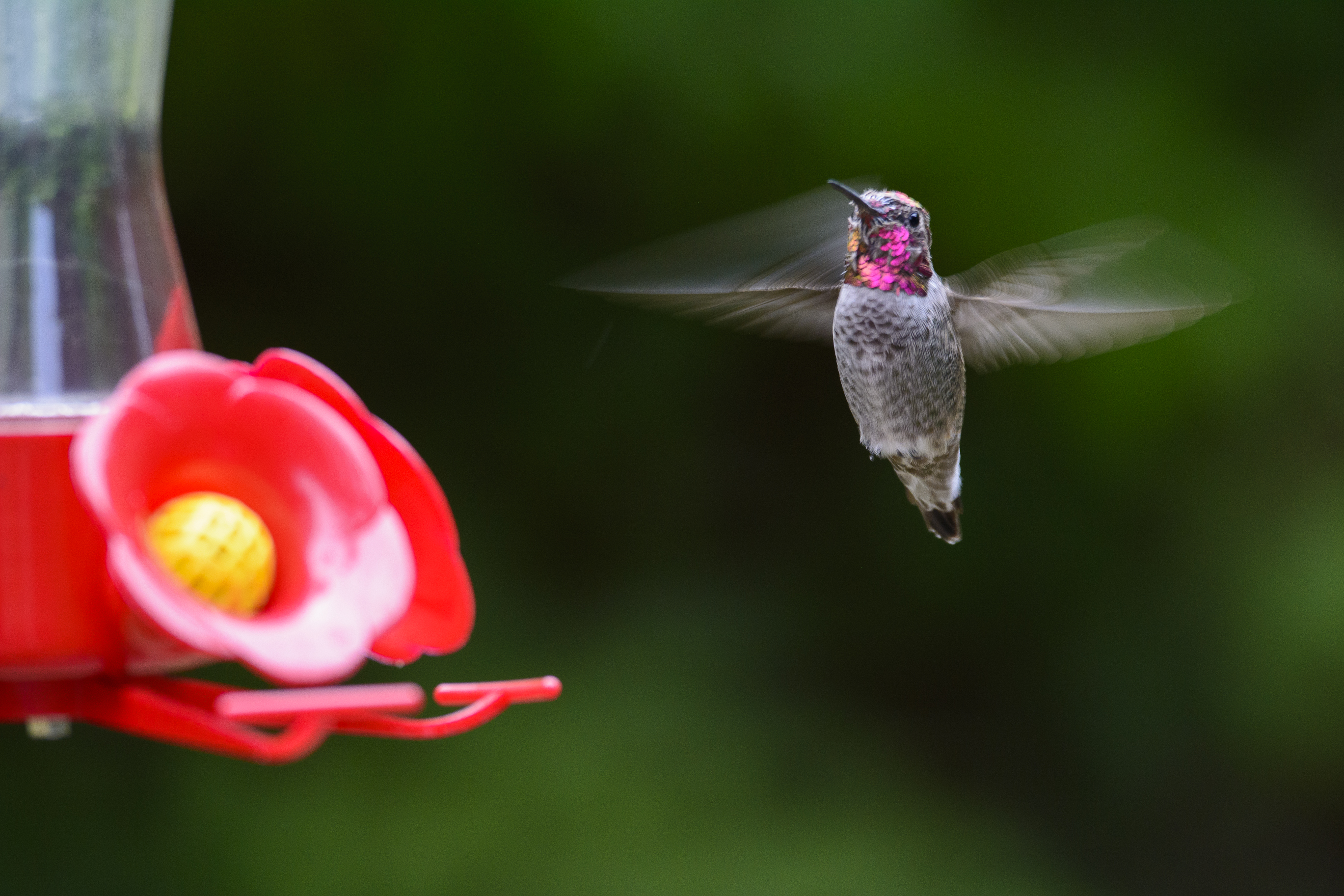 I attached my 80-400mm lens to the gimbal head. Everything held up perfectly. Then I attached my Nikon D7100 to the lens. Still perfect. I picked up the tripod with the gimbal head, camera and lens attached and walked outside to the center of my patio and gimbaled the heck out of things. I wasn’t expecting any birds to come but I heard one of the hummers expressing his dissatisfaction with my presence near the feeder so I aimed there. I was able to track the hummer fairly well but the gimbal head gives a different feel to the operation of the camera so it is something I’ll have to practice. After a few shots of the hummer at the feeder, I realized my ISO was too low for the overcast and unexpectedly damp conditions so I finally upped it to 1600 to get a decent shutter speed. I managed to get a couple of shots that I liked. They’re not tack sharp but I’ll work on that.