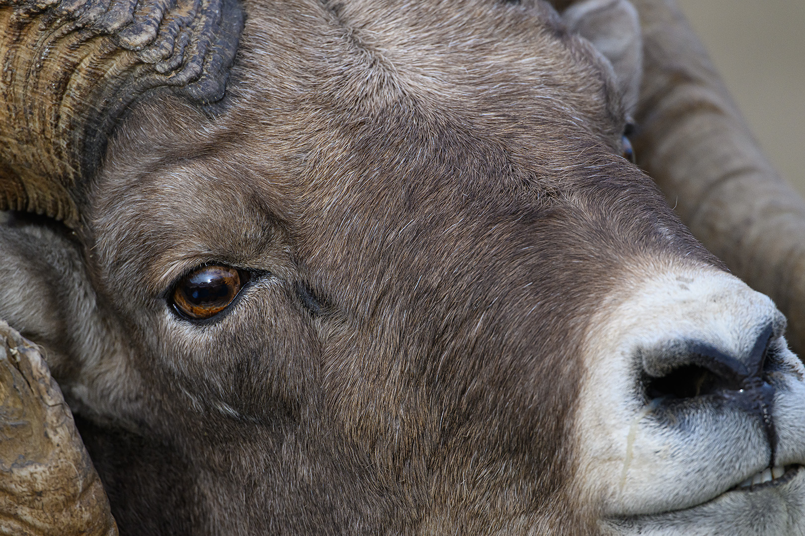 As I have said many times, Bighorn Sheep are among my favorite mammals to photograph. The Rocky Mountain Bighorns that we encountered in Yellowstone a few weeks ago were delightful to watch, especially the rams as they tried to interest the ewes and, when rebuffed, they went back to grazing as if that’s all they intended in the first place. They ventured fairly close to us as they munched on the grasses and when I attached the 1.4X teleconverter to my new Z600mmPF lens, I got really up close and personal photographs. I especially love that he’s looking right into my lens.