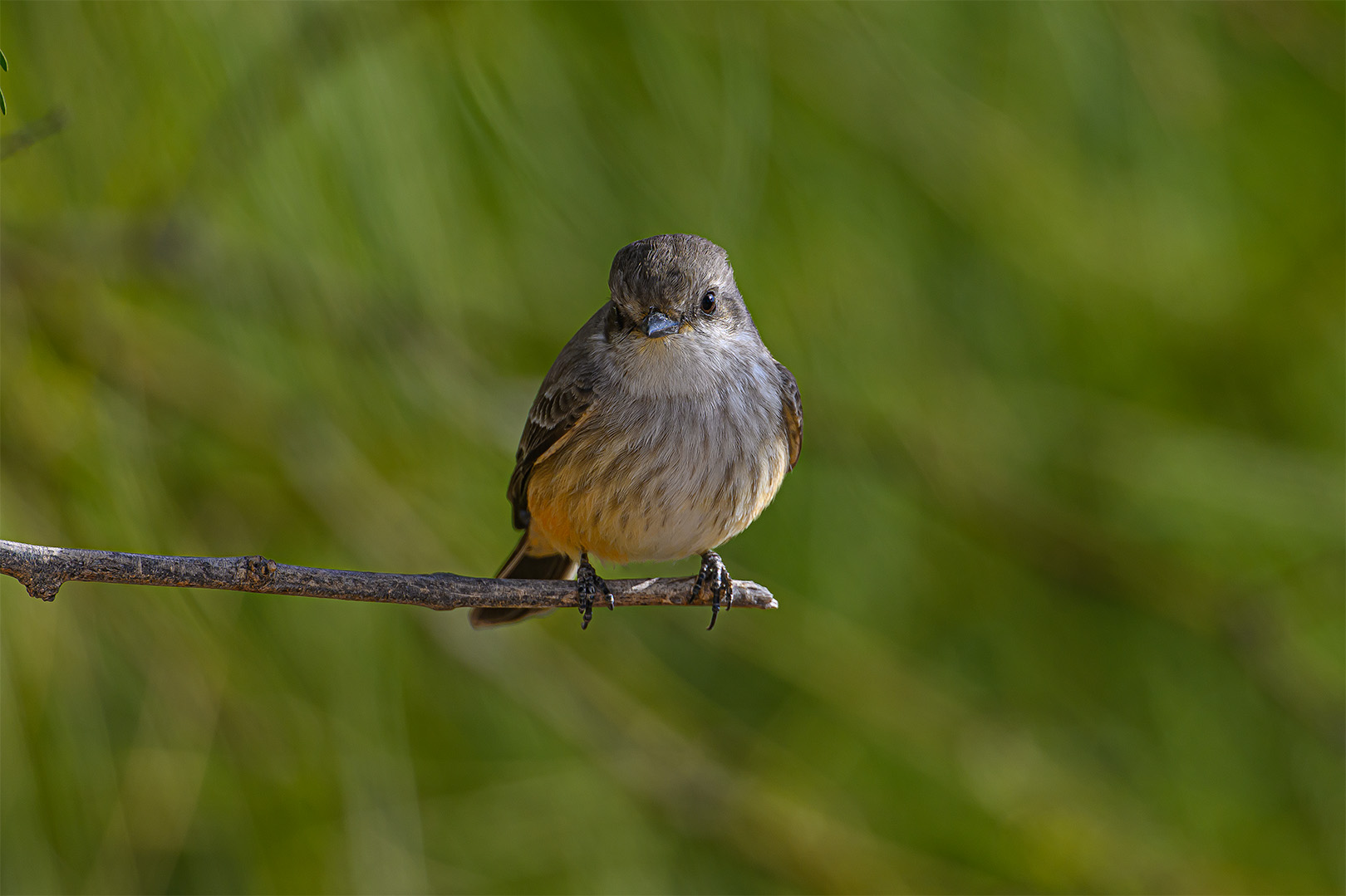 She was there, ever so briefly, the female Vermilion Flycatcher, poised on a branch in the morning light. Somewhat drab by comparison to her flashy male counterpart for whom the species gets its name because of his red-orange feathers. Vermilion is a red-orange pigment that was originally derived from the mineral cinnabar. She has a bit of color on her flanks but it is more a pale ochre than a bright vermilion.