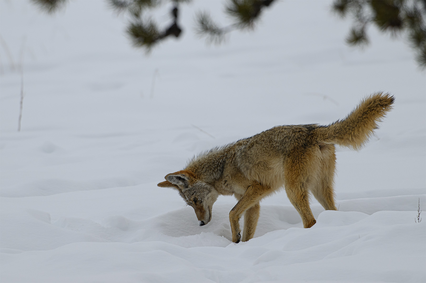 When Coyotes track prey like meadow voles, they rely on their keen sense of smell and acute hearing because the snow hides their target from view. They spring into the air and plunge face down into the snow but they don’t always hit their target. With the tip of its nose caked with snow from the plunge, the Coyote continued to search for its prey but came up with nothing so it trotted away to find a more fertile hunting grounds.