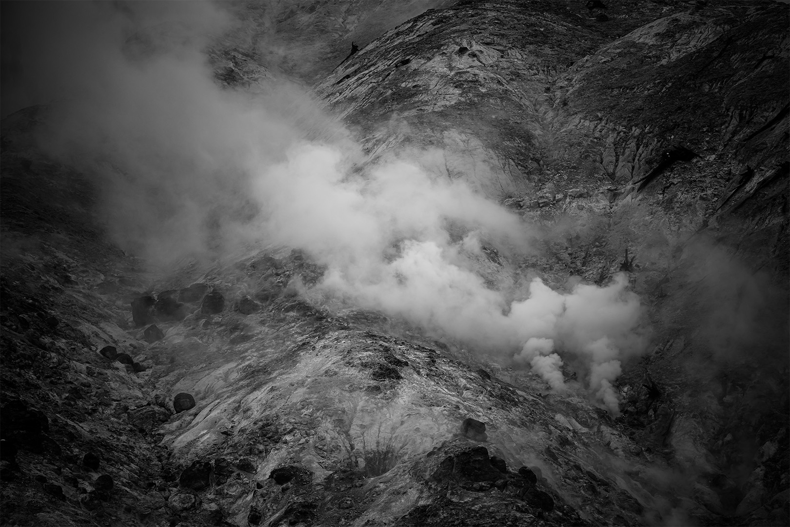 There is something decidedly otherworldly about Roaring Mountain in Yellowstone National Park. The fumaroles spew hydrogen sulfide and sulfur gases that fill the air with noxious smelling fumes. Nevertheless, the hissing sounds of the escaping steam and the ebb and flow of the resulting mist that waft over the stark mountain are captivating despite its alien appearance.