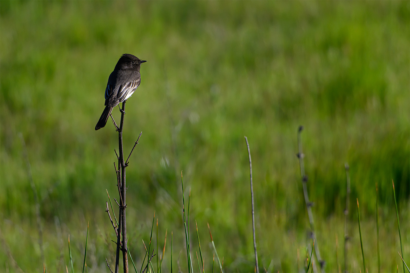 A Black Phoebe looks back toward me while perched on a twig in the green space between the shopping center and the Egret Rookery in Lincoln. The green background seems to be appropriate for Saint Patrick’s Day and I’m certain there must be a shamrock or two in that greenery. Since I am one quarter Irish, let me say Erin go bragh!
