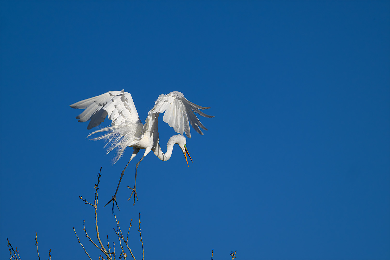 Announcing its return to the nesting area, a Great Egret squawks as it descends into its territory in the Cottonwood trees in the rookery. I added the 1.4X teleconverter to the Z600PF telephoto lens because the activity in the nesting area seemed to be happening on the far side of the trees so with the 2X TC, the effective focal length was 1200mm.