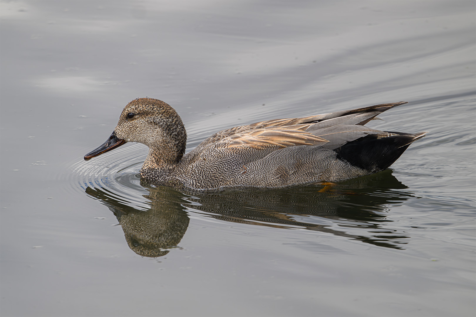 I love the alliteration of the phrase “dabbling duck.” To me it has an idyllic and serene connotation. When I saw this Gadwall at Lee Metcalf National Wildlife Refuge in Montana, that phrase came to my mind. The pond was glassy so only a few ripples from the duck’s forward movement break the calm. The Gadwall had recently dabbled, as evidenced by the water droplets on its head. Dabbling ducks slowly paddle around and dip their heads under water to feed, their feathered butts sticking straight up out of the water, seemingly not a care in the world. Dabble on, duck.