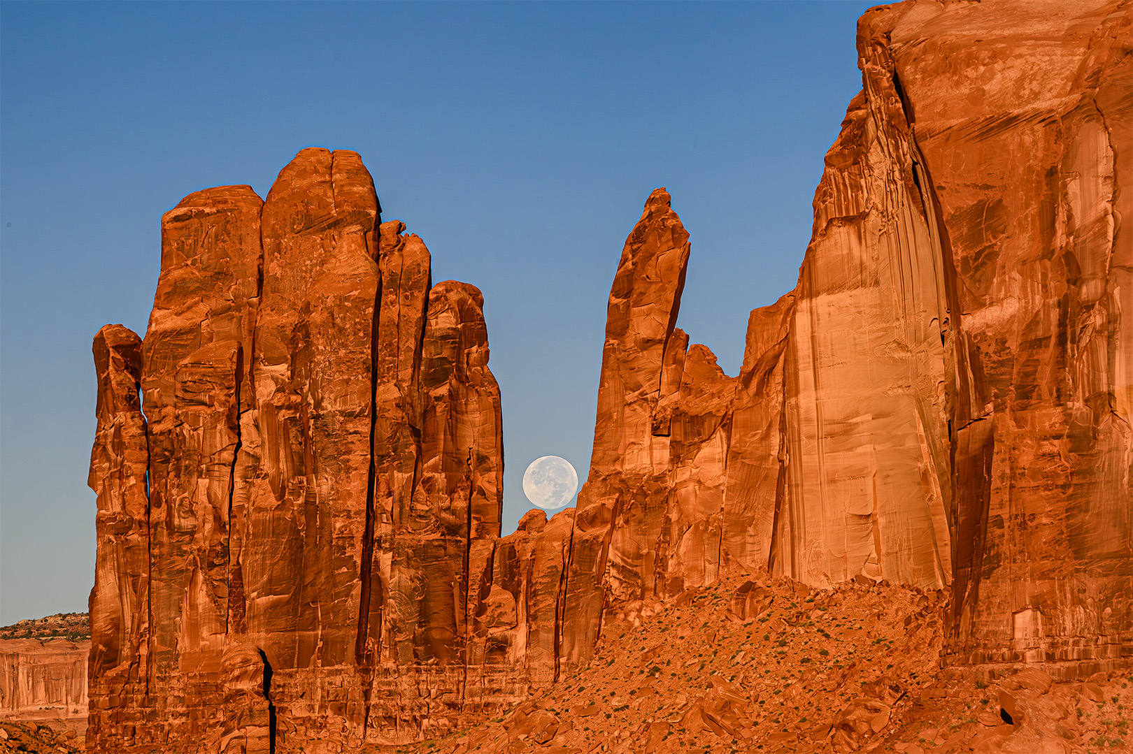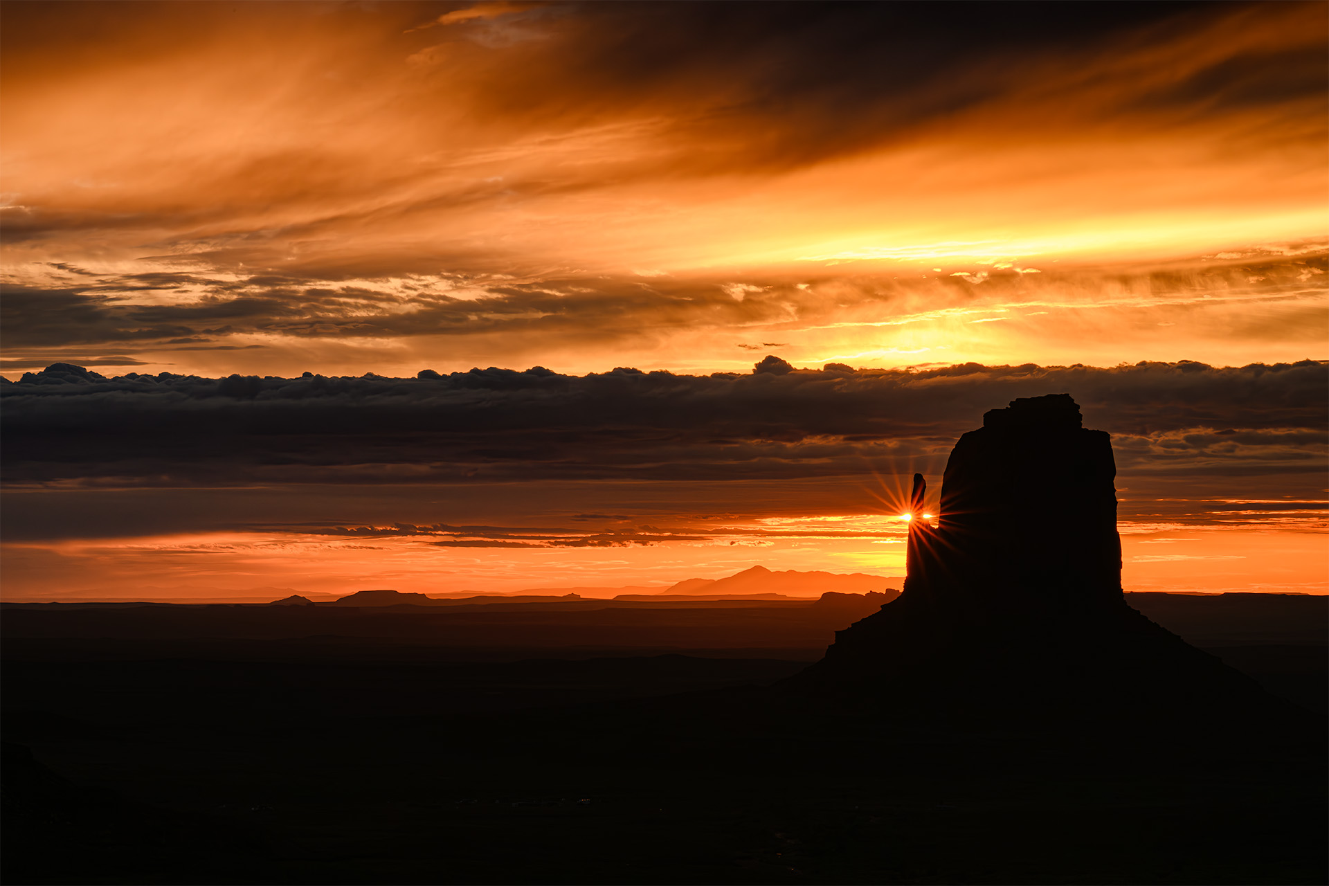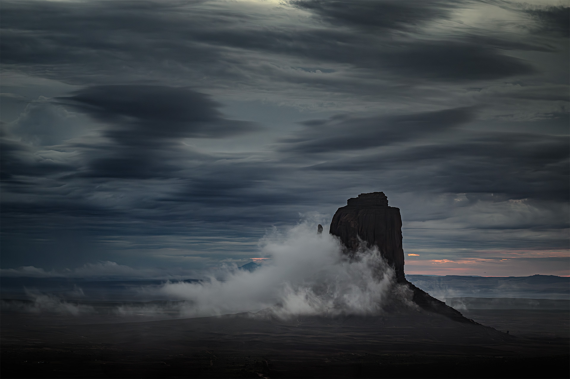 Although I was spoiled with the results I’ve gotten using a MIOPS Smart trigger to capture lightning over the years, I stupidly forgot to put mine in my day pack. When we returned to The View as the sun was setting, we didn’t go back to our rooms so I could retrieve mine but instead went to the outside viewing area near the parking lot. Lightning was striking around us and the Mittens but I was reduced to using a small aperture to get a long shutter speed and to just clicking away in the hopes that I would capture a random bolt of lightning. And, by the luck of the click, I did! It’s barely visible just to the right of West Mitten’s thumb, in the middle of the colorful sunset.
