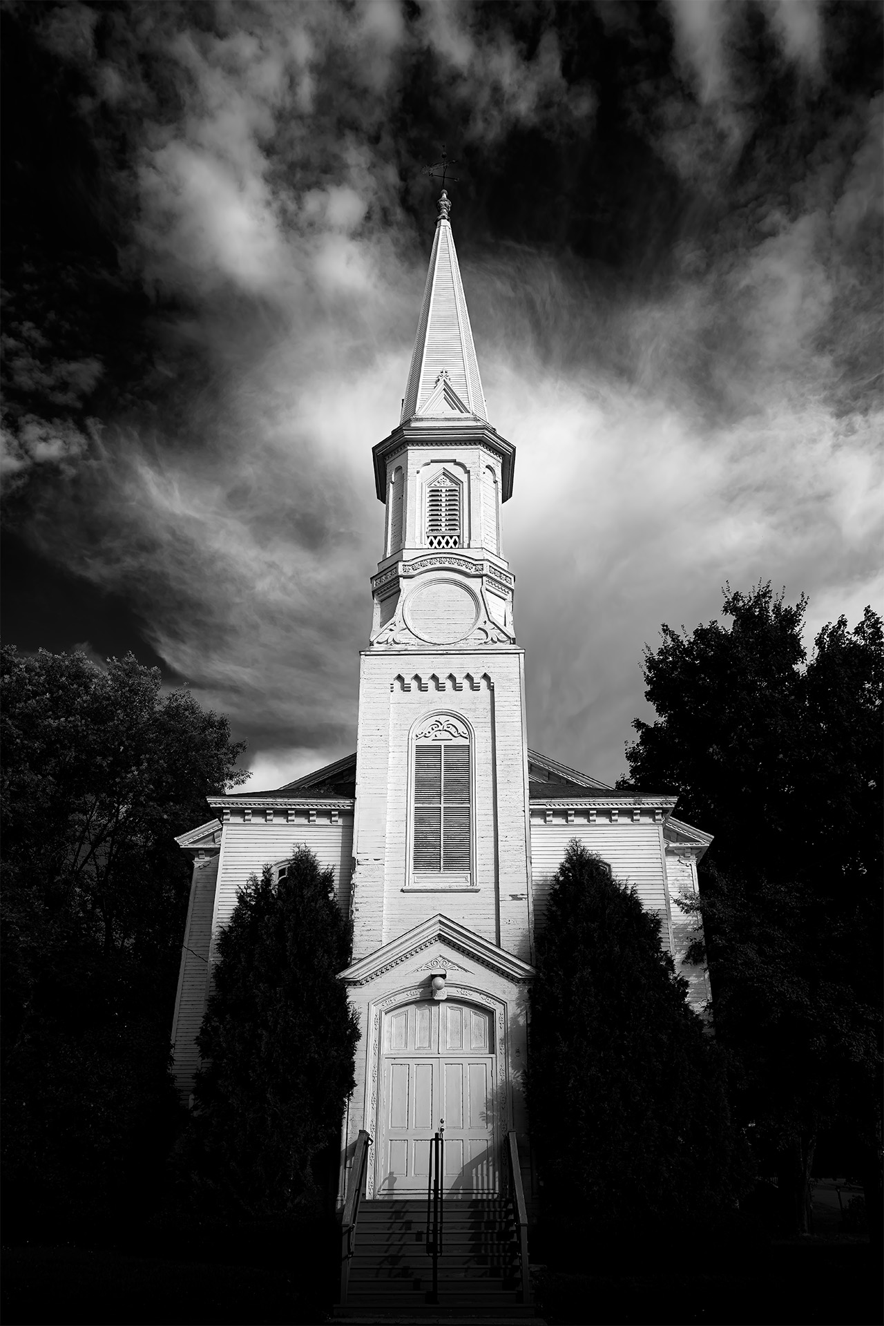 Like so many of the churches we saw in Maine, the church in Dexter was white and had a steeple topped with a weathervane. The First Universalist Church of Dexter, Maine was the first church built in the town, in 1829. The church captured our attention because its white exterior made it stand out and it was in excellent condition for its age. The clouds seemed to caress the steeple.