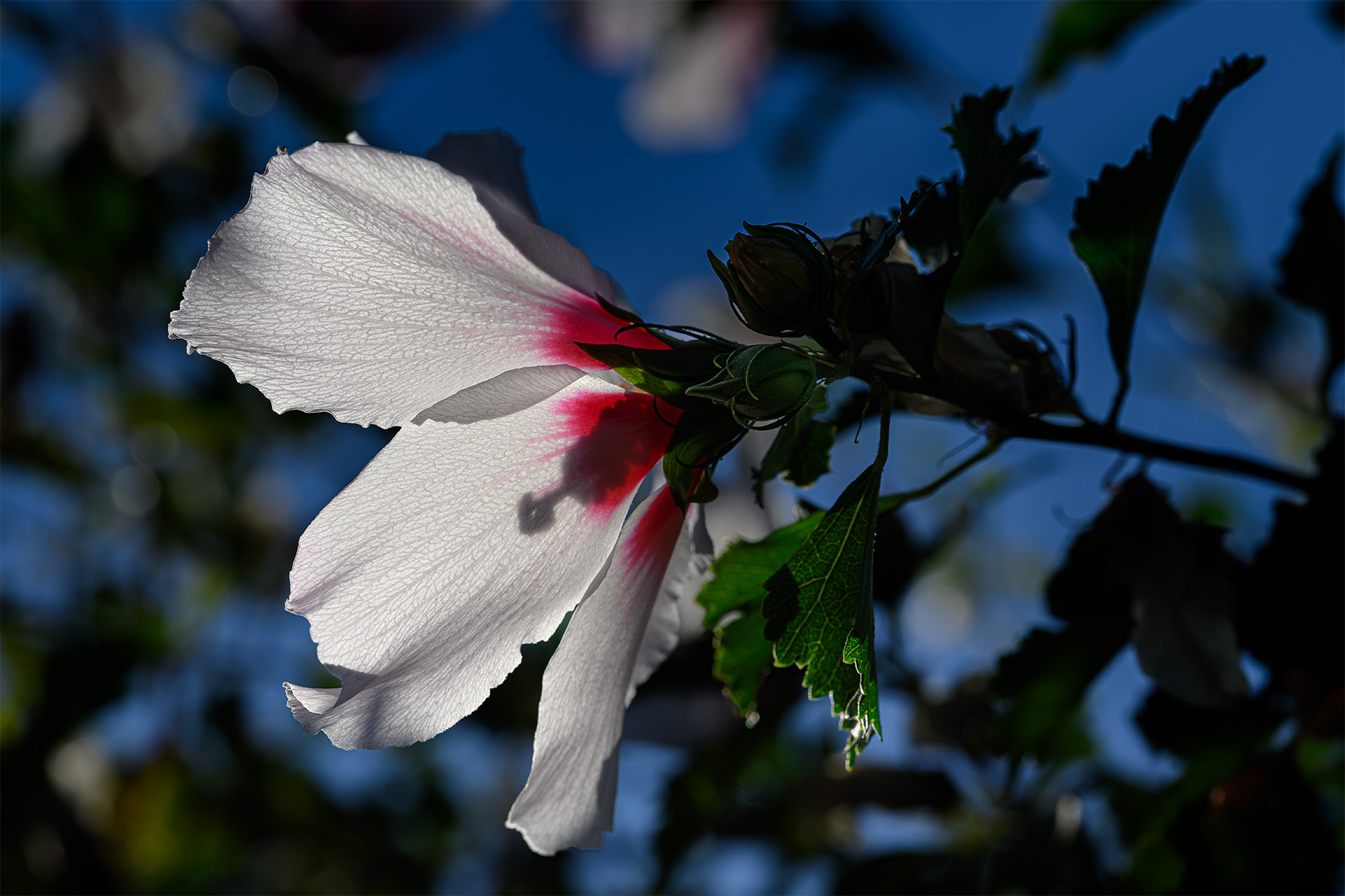 The other morning, I noticed that the Rose of Sharon is in full bloom. Several branches cascade over the top of the fence. The light was shining through the white blossoms, illuminating them so I got my Nikon Z8 and 105 macro and went back out. Then I heard one of the hummers making his presence known. He perched atop a bare twig at the top of the shrub and watched me as I took photographs of this blossom. When I turned my lens on him, he flew off. It’s nice to know that so many of the flowers in my garden are appreciated by the hummers.