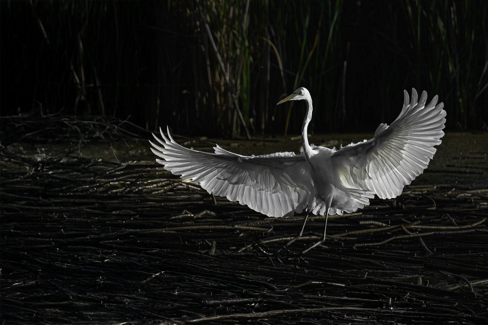Early the other morning at Ferrari Pond, I watched a Great Egret walking on top of the sea of dead reeds laying on the surface. The Egret suddenly fluttered into the air and moved toward me. The sun was still very low in the sky and the wings were beautifully backlit.