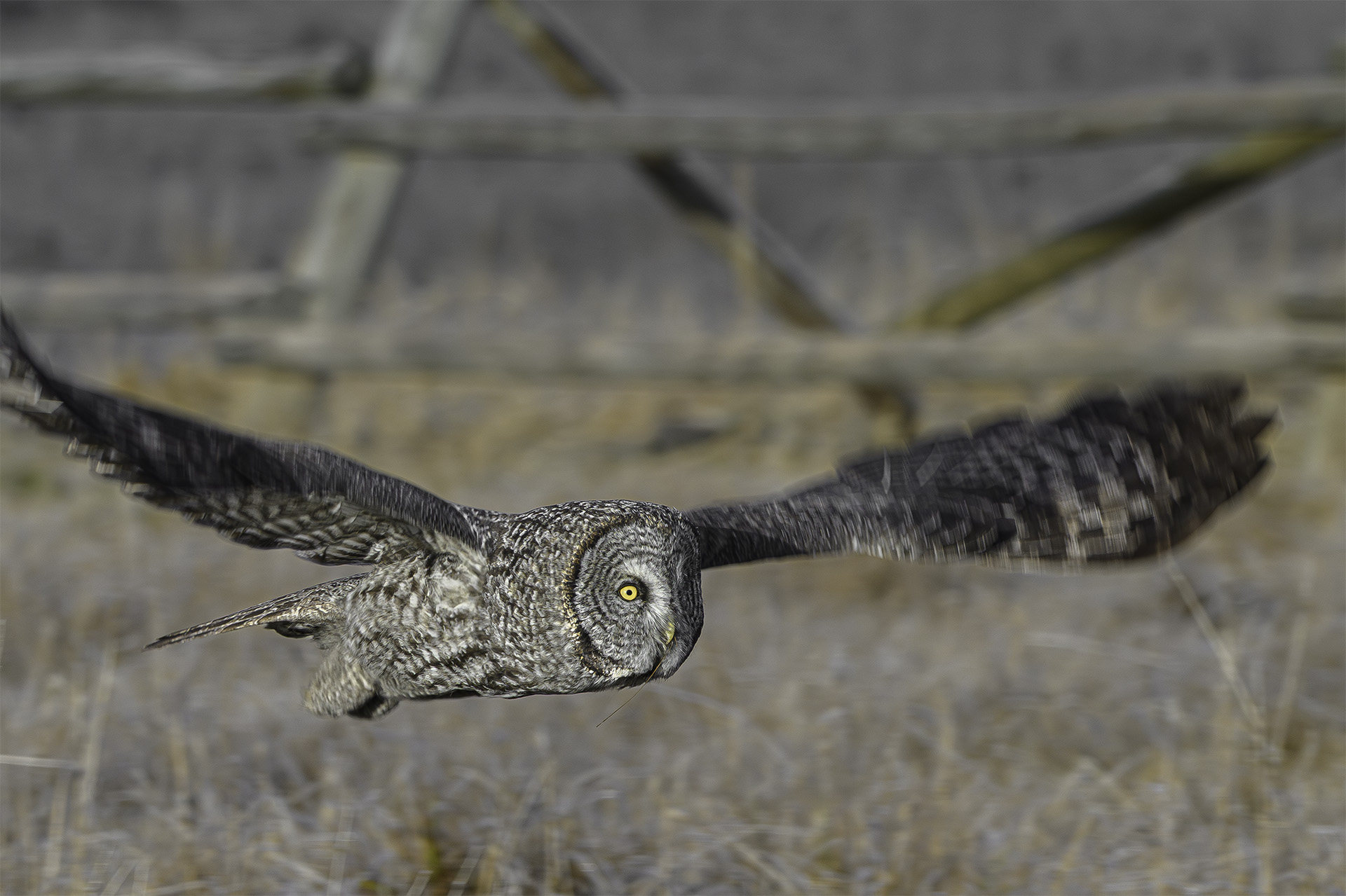 On our last morning in Yellowstone last week, we headed to Fishing Bridge where we had intel that the area was a Great Gray Owl’s hunting ground. When we arrived, a group of photographers had already gathered and the Great Gray Owl was perched on the limb of a pine tree surveying the meadow below. I was shooting vertical so when it took off, the owl was immediately out of the frame. It landed on the ground a short distance away and I quickly swiveled the camera back to horizontal so I was ready when it took off again. I got several flight shots, a first for me with a Great Gray Owl. I was concentrating on the bird and I didn’t even notice the fence in the background until I looked up as the owl flew to another limb in a tree behind me. I wish the fence weren’t there but at least it is the typical Wyoming buck and rail fence that I first discovered, and actually fell in love with, in the 60’s when I worked in the Grand Tetons so to me it is an acceptable “hand of man” for a wildlife photograph.