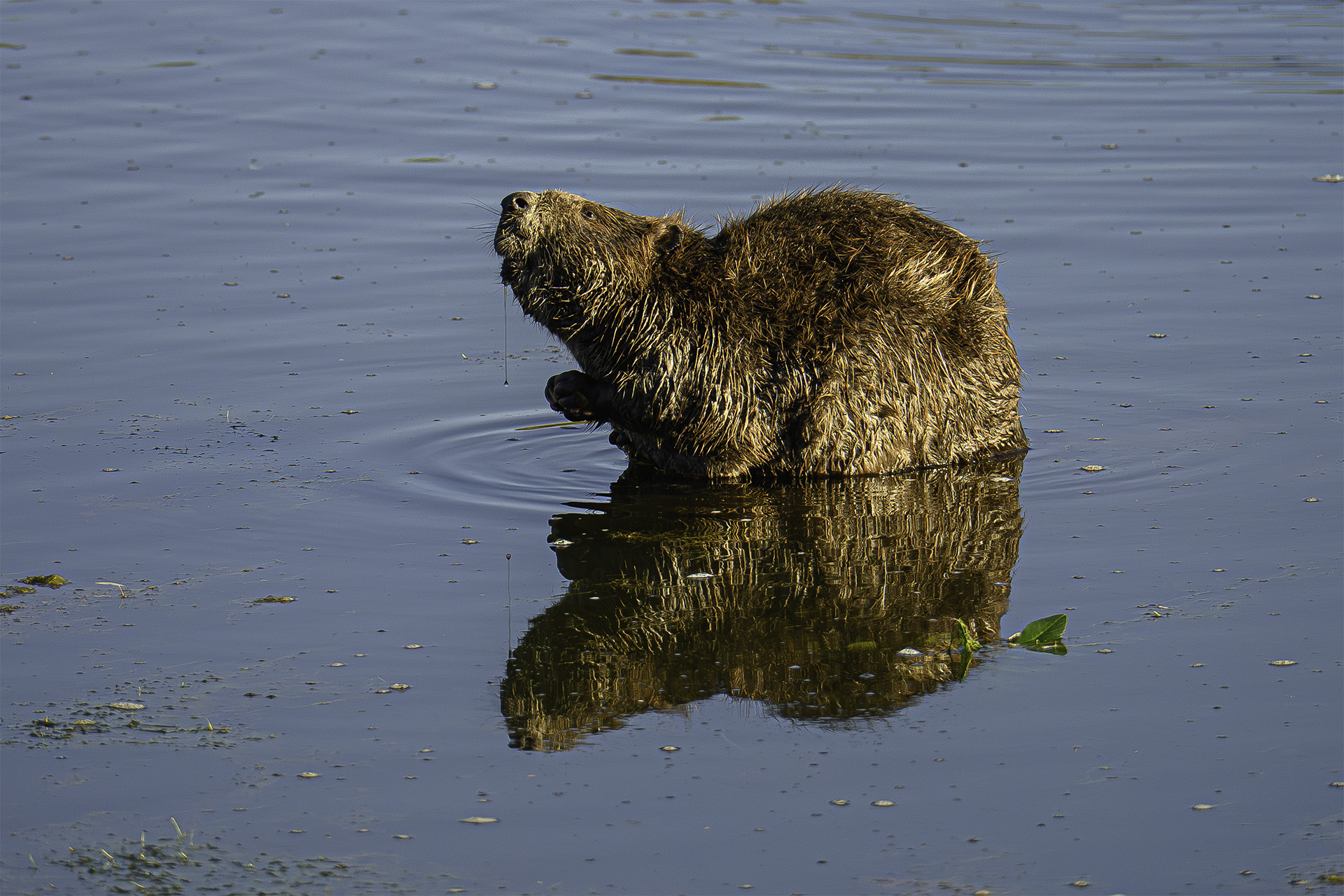 I was late leaving for my walk yesterday morning and a few minutes after I left, the phone rang. It was Truman. “Where are you?” he asked. “I’m almost to Sun Park Lane,” I answered. “Well, get over here. There’s a Beaver in Angler’s Cove and I think it’ll still be here when you get here.” I considered turning back, getting my longer lens and driving over but I figured it would be gone when I got there. I was wrong. It took me about 25 minutes to walk the mile and a half to Angler’s Cove and the Beaver was still there, perched on a submerged rock, grooming. Every so often it would stand, scratch its belly, swim a few laps under the bridge, and return to its grooming spot. It spent the better part of the morning there. I stopped in to check about 1 PM when I was out on an errand and it was still sitting on the same rock sunning. I hope it’s not a sign that the Beaver is ill. It didn’t seem distressed or in pain but it spent some time scratching. Right now, here at Sun City Lincoln Hills, they are doing warfare on the Beavers, including removing their dams from the creek that runs along Ferrari Pond Trail. I suppose that’s because they might have some deleterious effect on the golf course so naturally they have to go (she said facetiously).