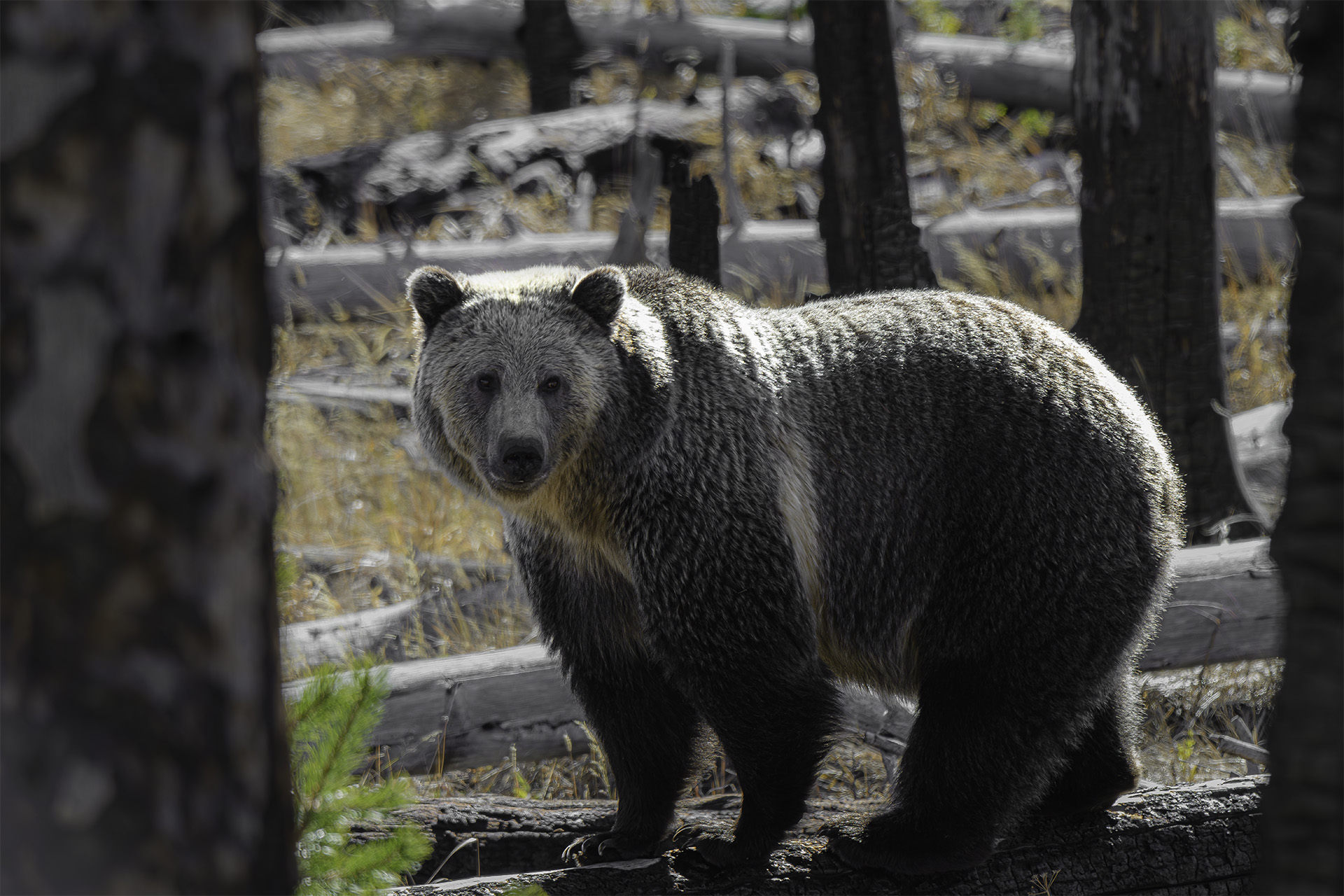We had lots of snow in Yellowstone two weeks ago. Well, we had snow and then we had Snow. The snow that fell from the sky was light and sporadic and for the most part, didn’t stick, especially in the lower elevations. The Snow we had near the Nine Mile Trailhead was in the form of an 11 year old 350 pound Grizzly sow well known to the park’s bear management team. Unlike the other snow, she stuck around and created quite the bear jam on the road. When she began to move forward toward the people congregating up on the edge of the roadway, a bear manager shouted sharply, “No ma’am! No ma’am!” His loud admonition startled me and it certainly startled Snow who quickly reversed direction and ran back to a more acceptable distance. It was obviously not her first encounter. She soon climbed under some branches of some downed trees and took a nap.