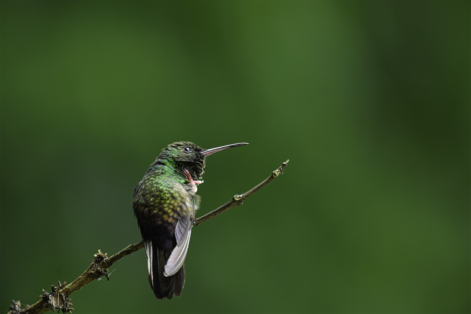 It’s fascinating to watch birds scratching an itch. Over the years, I have been amazed to see how often birds scratch their heads and necks and, how often I have photographed various birds scratching. I ran across this shot yesterday when I was reviewing photographs from a trip to Costa Rica this past March. The Bronze-tailed Plumeleteer that had been so elusive when I visited there in 2024 was constantly on display in 2025, perching, defending his perch, stretching, and preening. Occasionally it would scratch its neck. The hummer’s bright red foot stands out as it reaches up to scratch that itch!