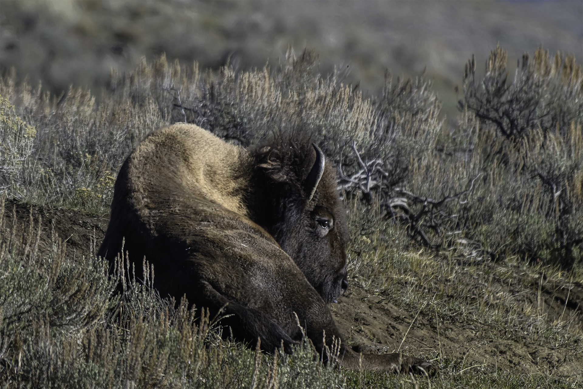 On my last trip to Yellowstone in October, we encountered this bull Bison resting in the middle of a Bison wallow, apparently tuckered out after wallowing. He had just finished coating himself with dirt which is what Bison do to shed excess fur, relieve skin irritations, and stay cool. These Bison wallows are quite common throughout the Yellowstone area where Bison roam and it is. not uncommon to see them take turns in the wallow.