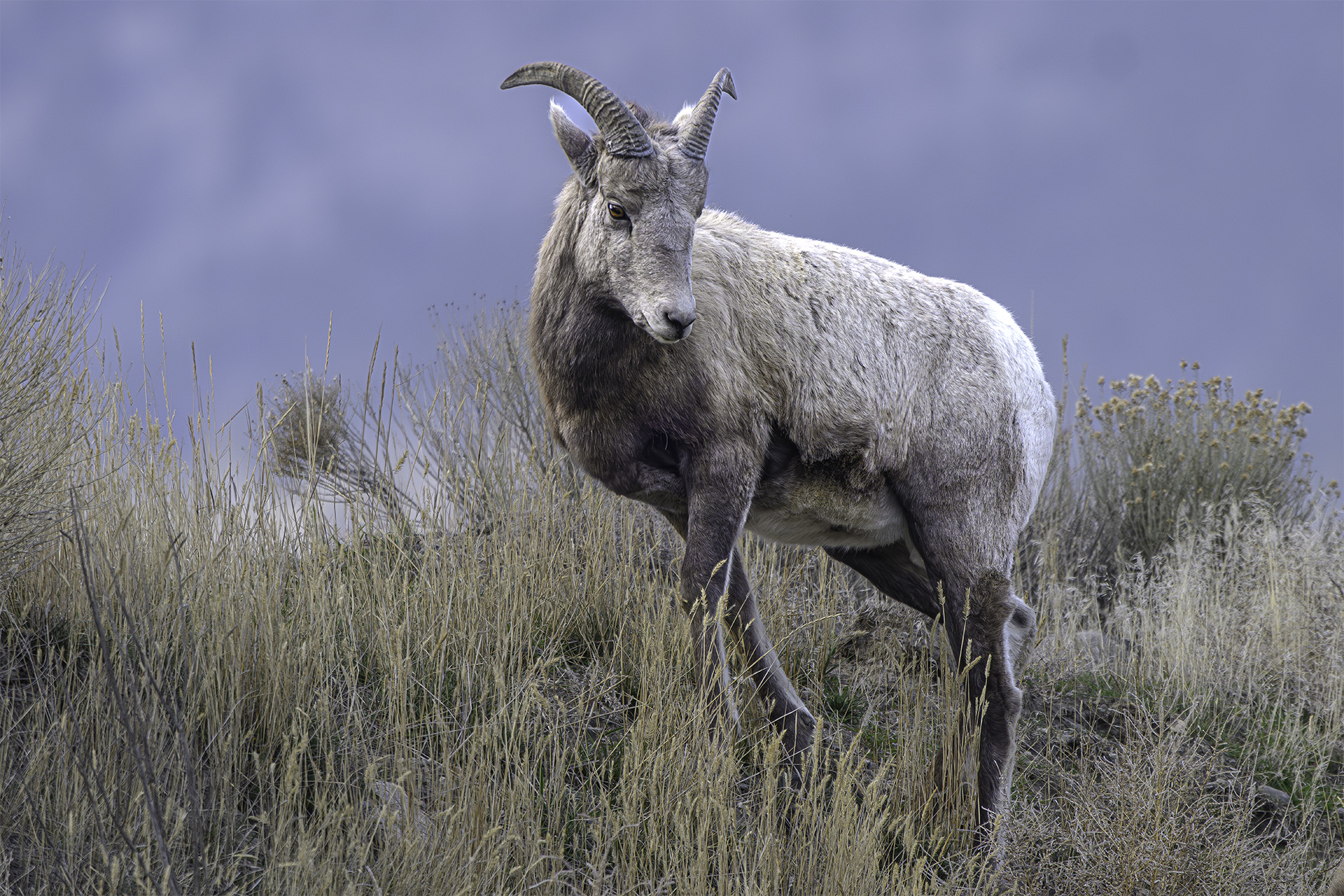 As a flock of Bighorn Sheep made their way to drink at the edge of a river, one of a young ram watched the rest of the flock from the hillside, deciding when to make the move. It was a few minutes before he and a few ewes made their way down. As their moms carefully descended, the lambs bounded down too, leaping as they reached the bottom of the hill.