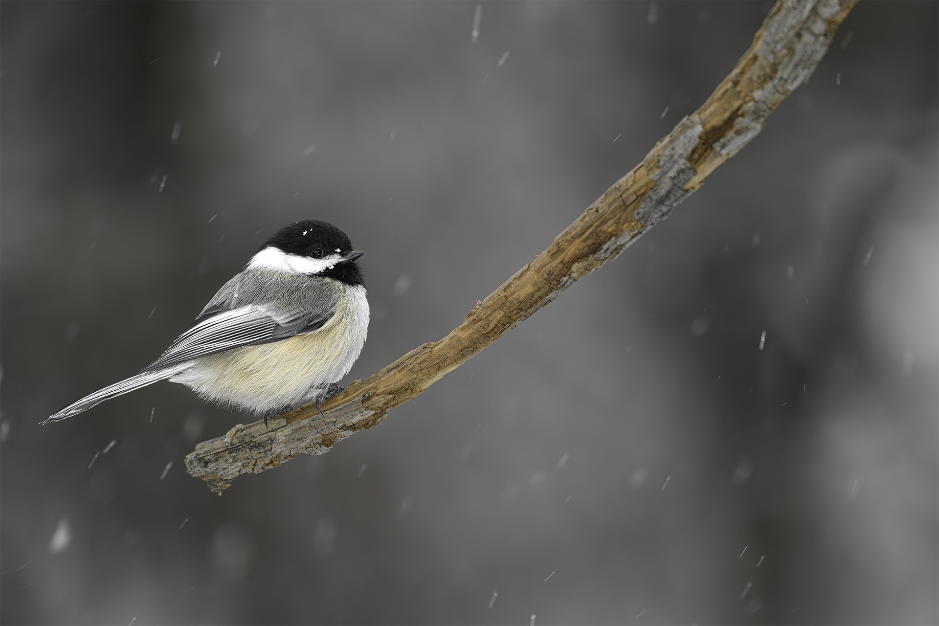 It seems as if every photography trip I go on has a standout species that dominates the viewfinder and becomes the standout star of the trip, regardless of which species we were originally hoping to photograph. The star this past week in Sax-Zim Bog was definitely the adorable Black-capped Chickadee. We were hoping to photograph owls, including last year’s star, the Great Gray Owl, but no Great Grays have been seen there recently. Lucky for us, the Black-capped Chickadee seemed to be everywhere we went. On our last day, it snowed. A few flakes even landed on the chickadee’s black cap.