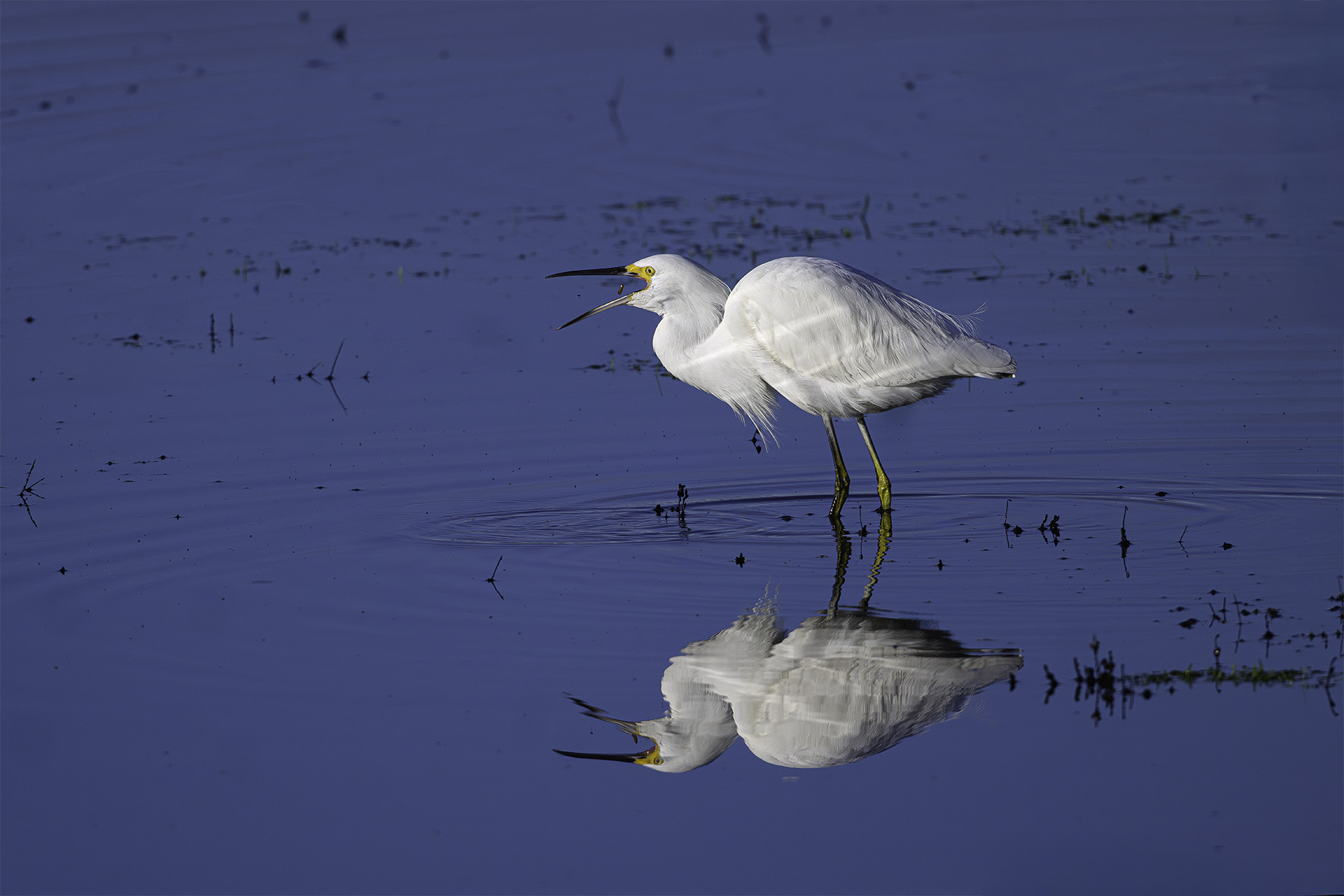 The sun was out the other day at Ferrari Pond. The ponds, many like this one filled only recently by the unrelenting rains just days before, were filled with birds, including about a half dozen Snowy Egrets. Snowy Egrets swish their feet in shallow ponds to stir up small fish, crustaceans, and whatever it is that this Snowy is gulping down. It doesn’t seem to have fins or a tail like a tiny fish or claws and legs like a tiny crawdad. As soon as the Snowy Egret swallowed its mystery meal, it returned to swishing its feet in the shallow water to find something else to gulp down.
