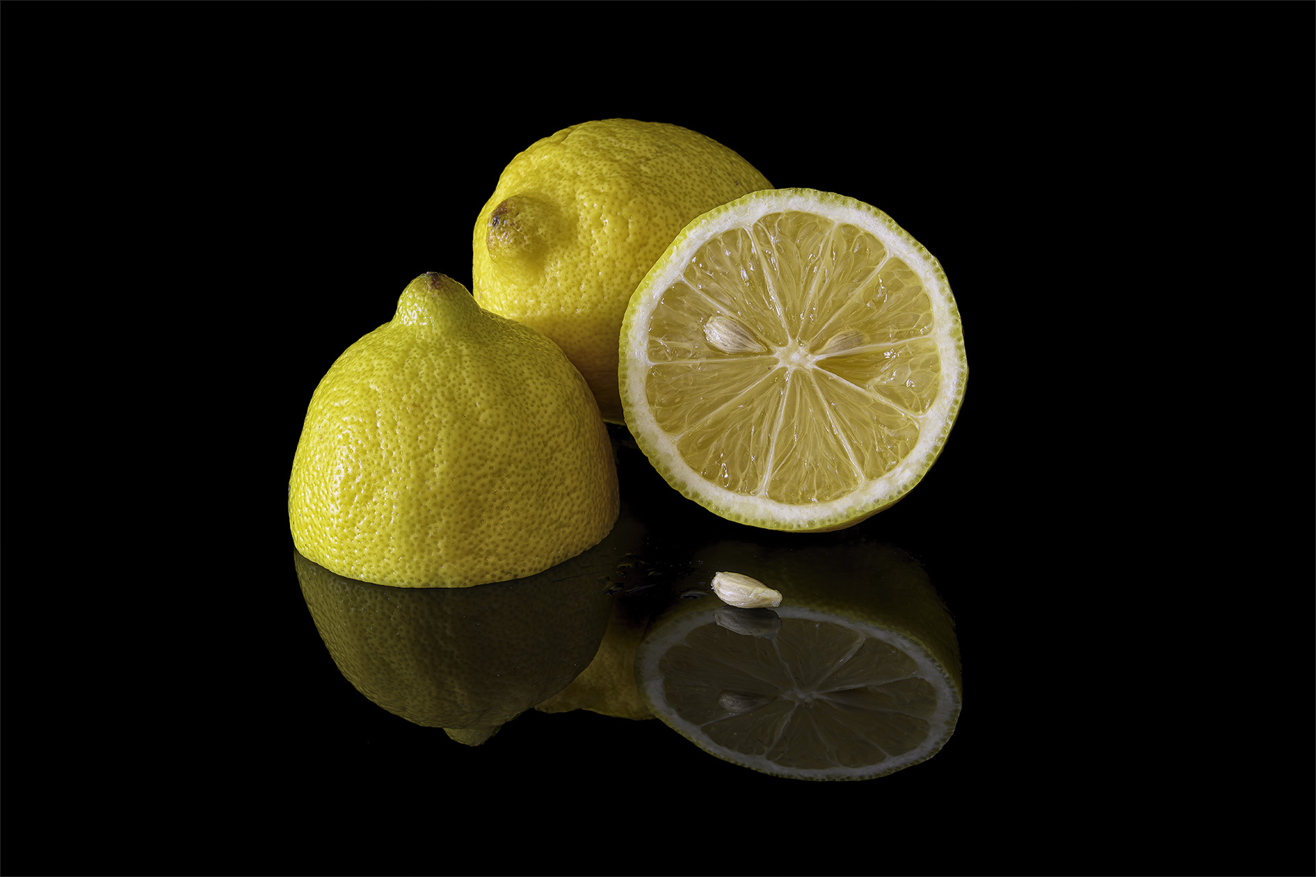 My lemon tree, which produces an overabundance of lemons, is once again covered with fruit, most of them ripe, and many too high to reach. On Christmas Day, I plucked a couple of the low-hanging fruit to squeeze onto the Dungeness crab I was planning to have for my Christmas dinner. Black acrylic and natural light created the reflection.
