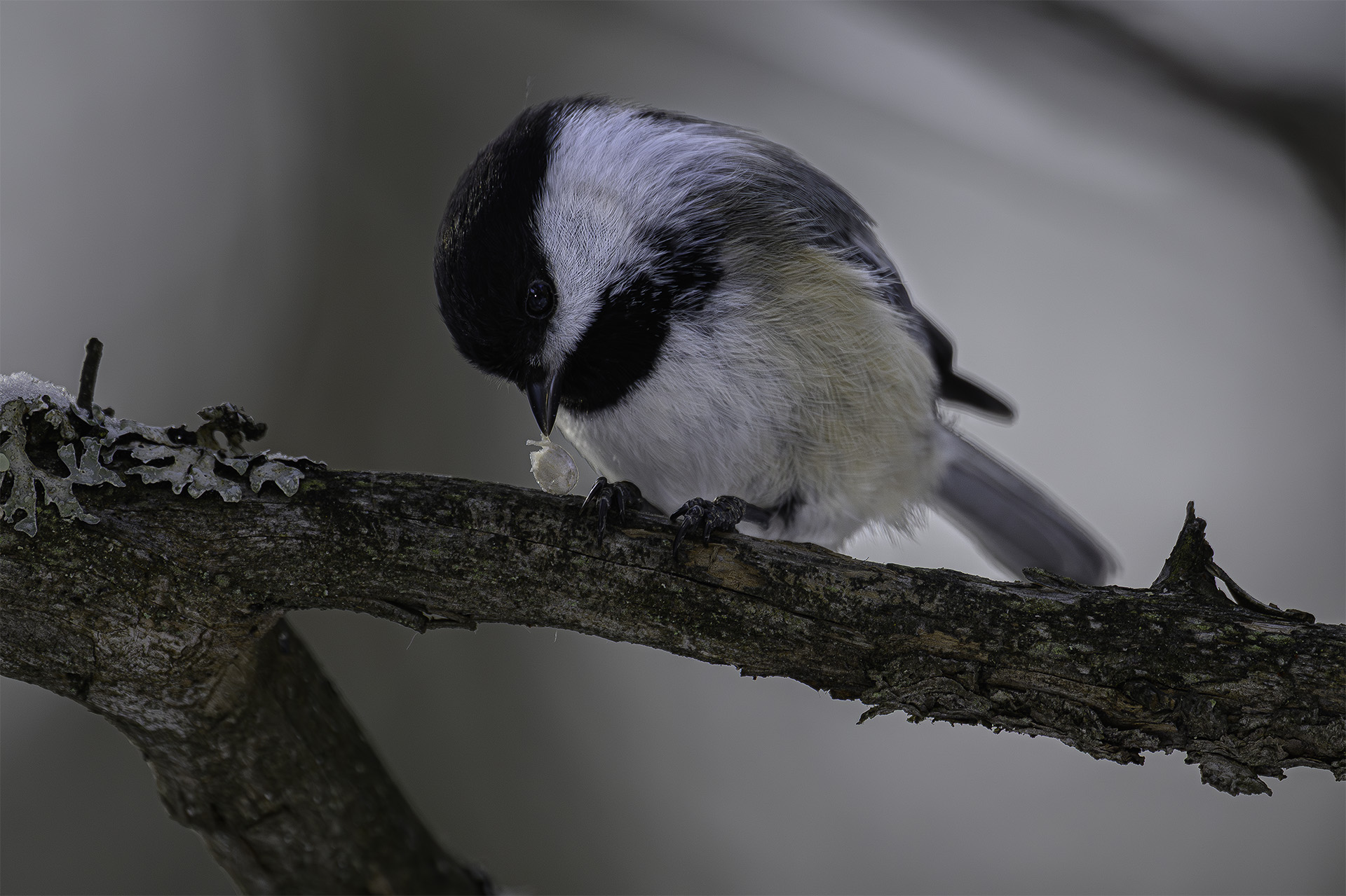 Black-capped Chickadees are everywhere at Sax-Zim Bog. This tiny bird is one of my favorites at the Bog. They are quick and rarely stay still. They do spend a fair amount of time extracting the nourishing seed from black-oil sunflower seed shells that are in the feeders filled by Bog volunteers. Shelling a sunflower seed is one of the few times that they’re relatively still and they are quite adept at doing this. However, once this chore is done, and they’ve gulped down the kernel, they’re off to find another one as this Chickadee is about to do.