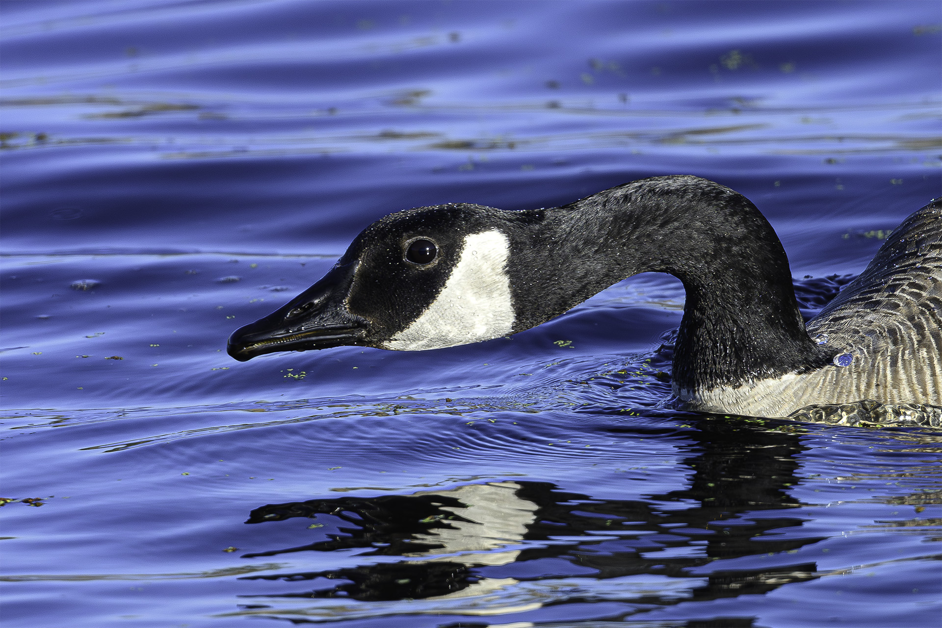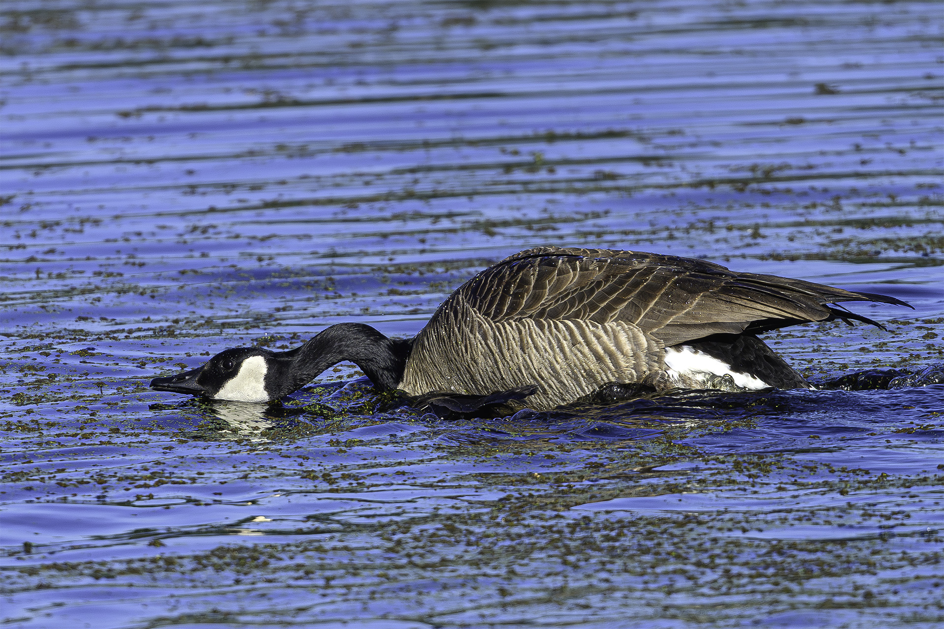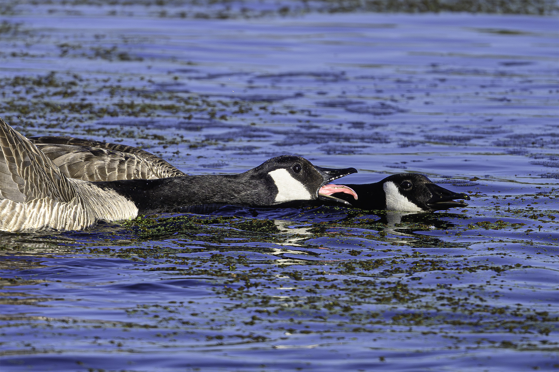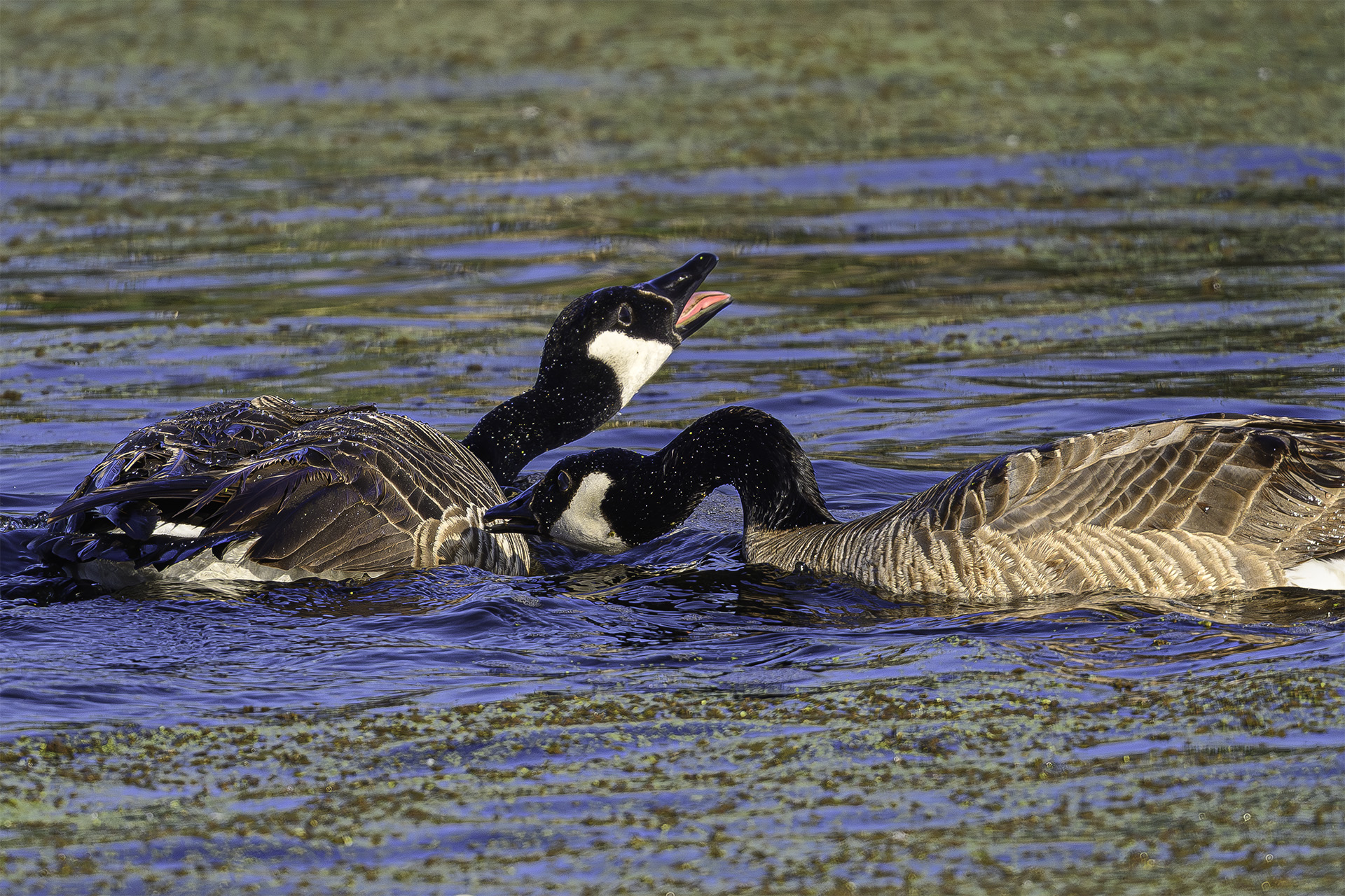 The Canada Geese were in fine fettle here yesterday. Yes those golf course denizens that strut across the streets here in large flocks, daring anyone to drive past them, were creating quite a ruckus. I don’t normally bother photographing them unless they’ve got those adorable chicks. Although they are quite striking-looking birds, they are so common that I usually walk right past them. What I presume to be the males, seemingly with nothing else to do since their mates are either sitting on nests or brooding young, were warring noisily in the pond. I watched from the golf cart bridge as one pursued another, splashing across the water, bashing his beak against the rival’s side, staring the rival down, then, pushing him under the water. I’m thinking that the neck curvature indicates extreme displeasure. In the last image, the rival, just a sliver of his tail showing just behind the neck of the dominant goose, is completely submerged as the other goose appears to push him under water. No blood was drawn and no one drowned but it was a fascinating display to observe.