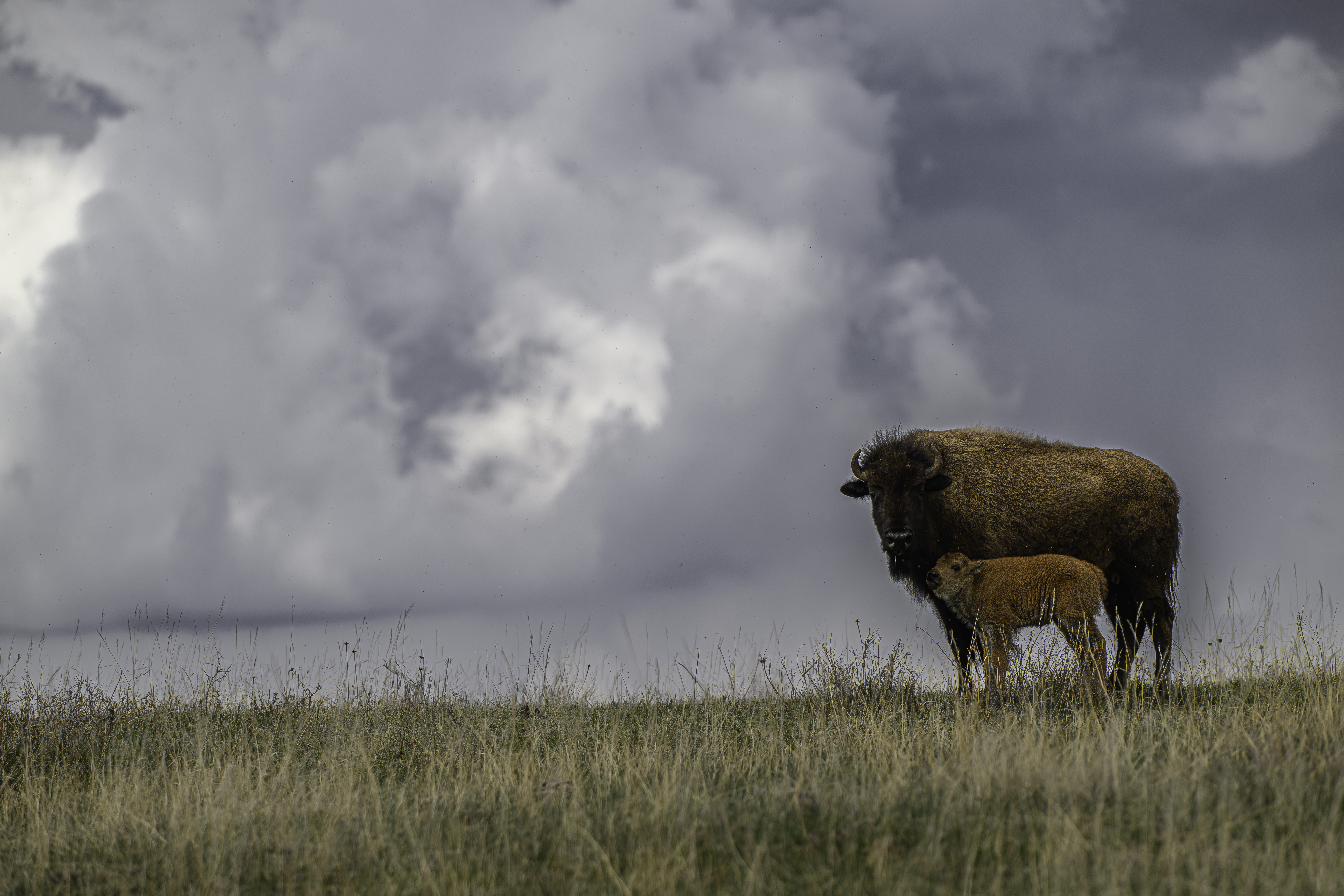 There were lots of Red Dogs in Custer State Park a few weeks ago. Red Dogs are the Bison calves that for the first few weeks of their lives, have a red coat. We saw lots of calves still with their umbilical cords attached. I don’t know how old this one was but probably only a couple of days old. The herd was on a slope when we drove by and this pair walked up to the ridge line and looked back. The storm clouds were headed our way.