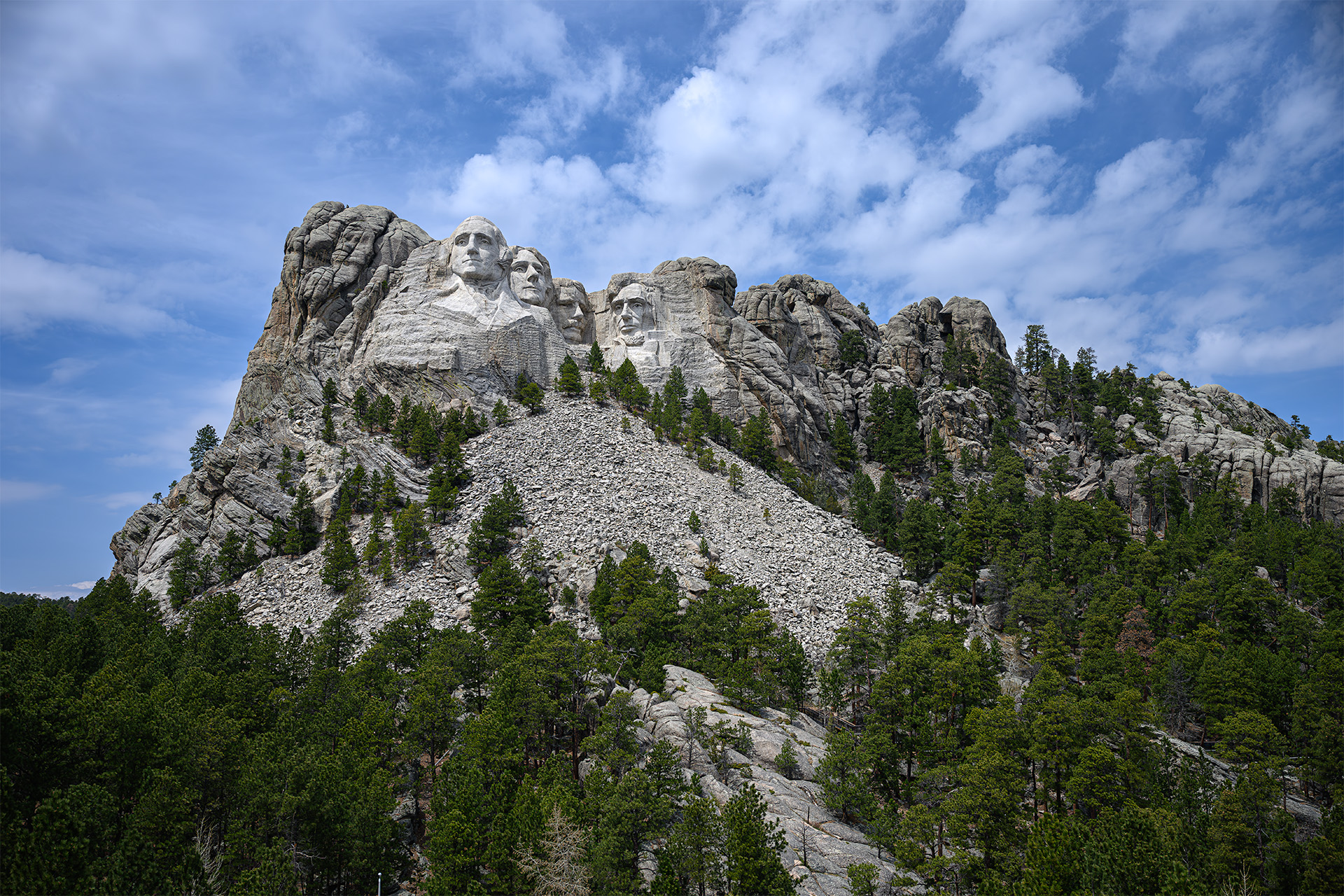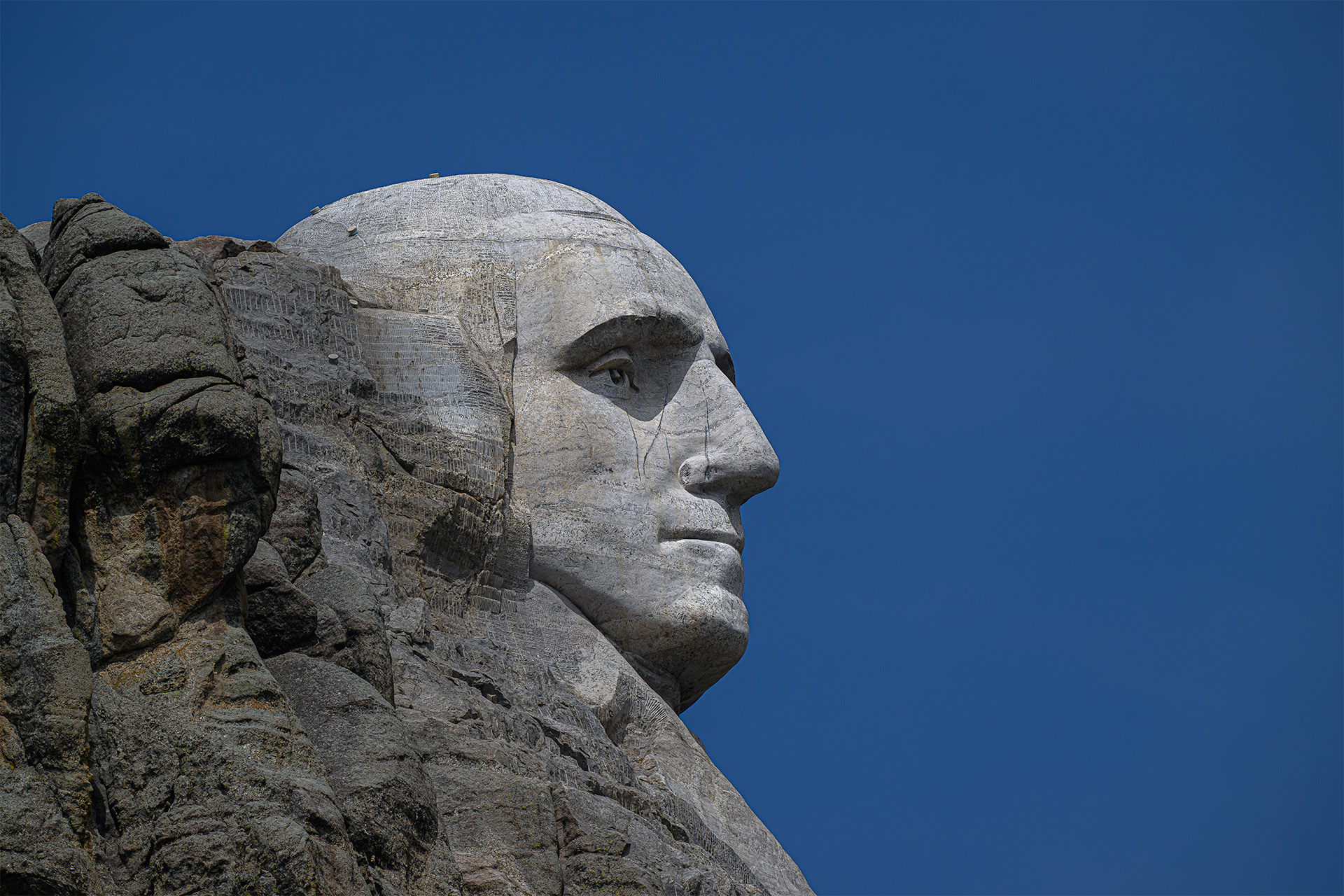 Seeing the iconic faces of past presidents George, Tom, Teddie, and Abe in person, carved onto the face of Mt.Rushmore, is a very moving experience. And it is moving in many ways. Visible in the second image on George’s head are electronic instruments capable of measuring even the slightest movement in three dimensions on the massive heads. These monitors were placed along some of the major fractures in the sculptures which have been sealed with epoxy. To date, no movement of the granite sculpture has been detected. It seems that these sculptures will be here for a long time to come.