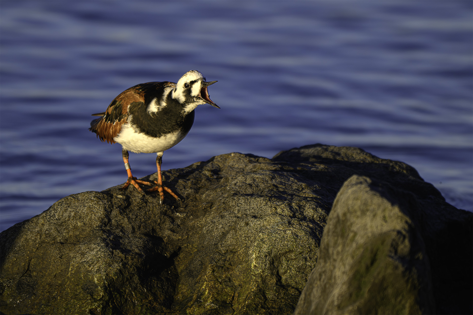 “You scream, I scream, we all scream for ice cream!” I’m pretty sure that’s what this Ruddy Turnstone is calling out. On our second day here in Delaware, an adult in full breeding plumage brought all his friends with him to the rocks at the edge of the water as the morning tide ebbed in the nature preserve and salt marsh where we ended our previous day’s shooting. They came in huge numbers and gave us a morning of spectacular photography most likely because we ate ice cream the previous afternoon. As much tradition on a wildlife trip with Moose as it is a proven fact, eating ice cream ensures successful wildlife photography and in particular, bird photography. Despite high winds, even more intense than the day before, the birds congregated near us on the shore, scooping up Horseshoe Crab eggs. When an occasional vehicle passed, many in the flocks flushed and flew over the water in magnificent murmurations before alighting again to feed and take shelter from the wind. This Turnstone has a band, probably attached just the day before by a team of biologists studying shorebirds who have been at this spot both days, banding birds for their studies.