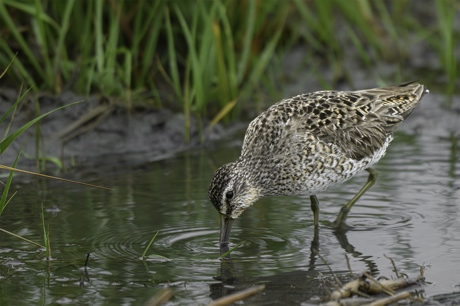 A Short-billed Dowitcher probes the shallow marsh waters near Delaware Bay for something to eat as the high tide begins to recede. At this time of year, the Horseshoe Crabs lay massive amounts of eggs that provide sustenance for many of the shorebirds migrating through the area en route to nesting grounds in tundra to the north.