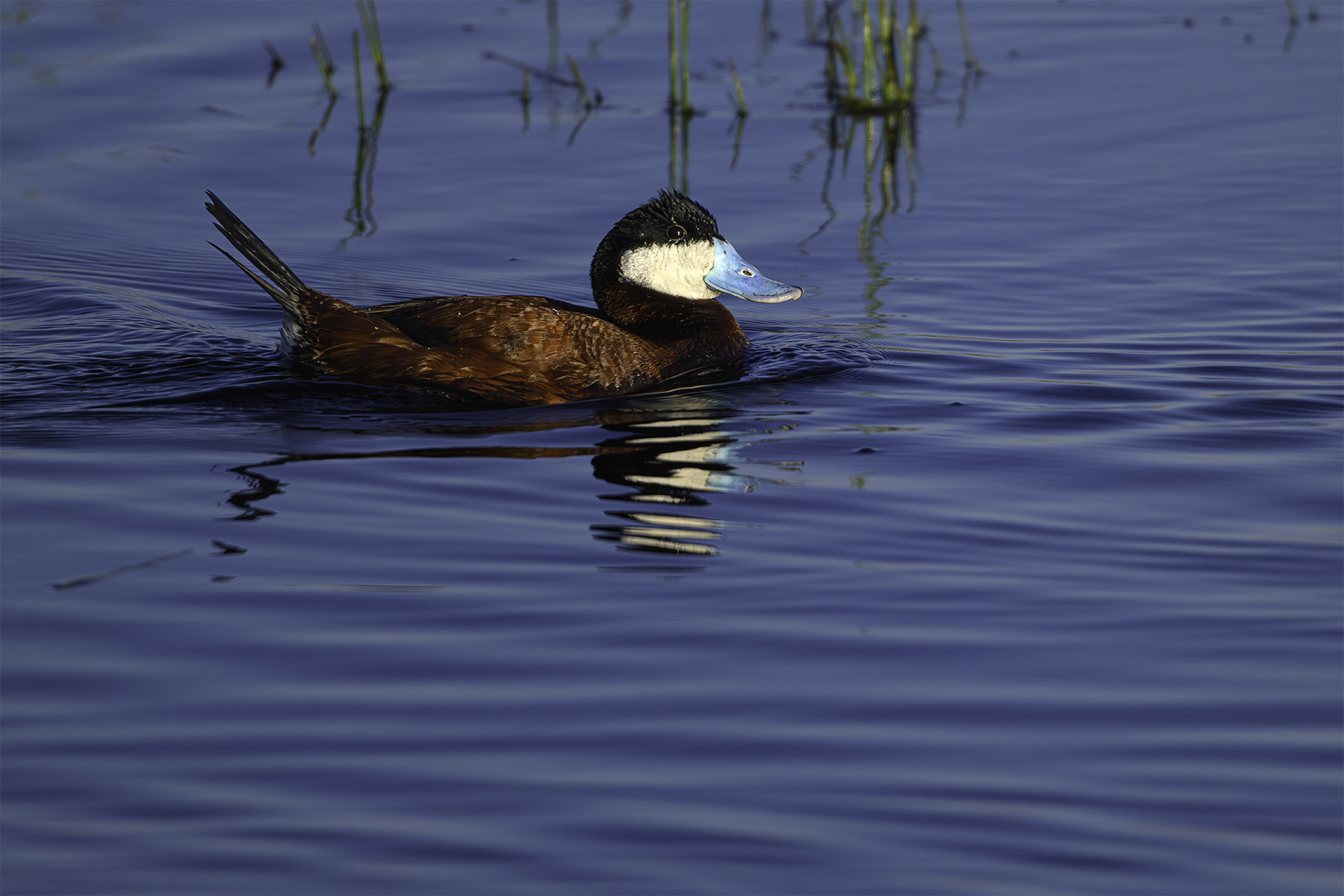 When I first saw this male Ruddy Duck, I did a double take. A vibrant blue bill? It doesn’t look real but it is! Male Ruddy Duck’s in breeding plumage turn that ruddy color and their bill becomes a bright sky blue. When we saw this bird in Sierra Valley a few weeks ago, he was agitated and charging at another male. Both had their tails up and they roiled the water causing bubbles to form under them. It was quite fascinating behavior to witness. Of course there was a female nearby. We didn’t stay to see who won her affections.
